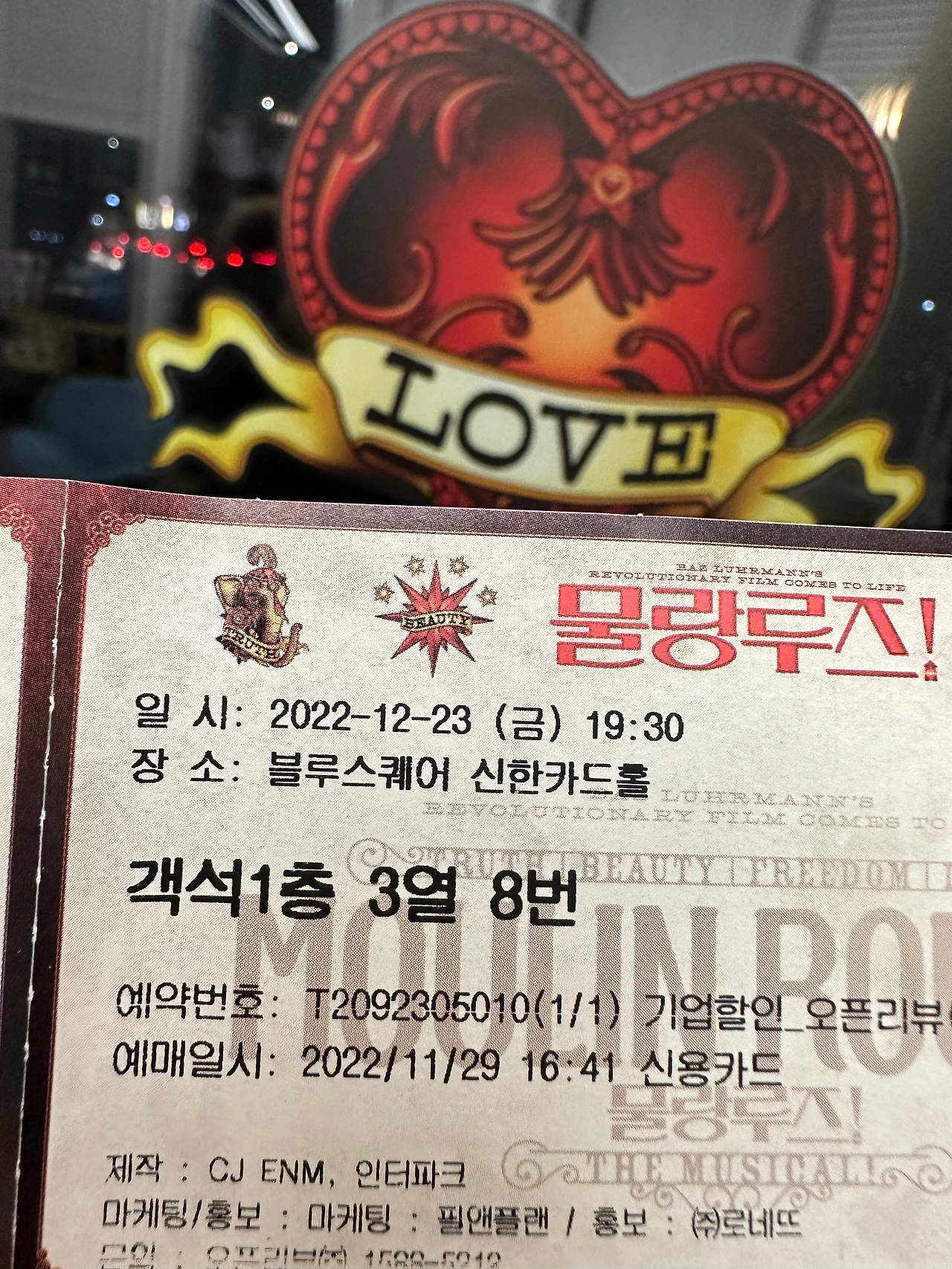 물랑루즈 뮤지컬 한국 초연에 신별쌤 함께 한다길래 블루스퀘어로 총총. 익숙한 노래들과 안무들이 많이 나와서 신기했던 공연이었고, 서울에서 몽마르트의 물랑루즈를 느낄 수 있어서 좋았던 것 같다!