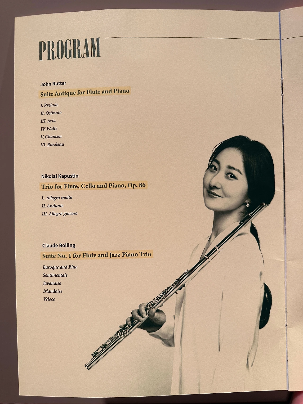 플루트 리사이틀은 처음 본 것 같은데 좋았던 것 같다. 프로그램북을 처음 봤을 때 카푸친이 제일 기대되고 존 루터가 제일 기대가 안되었는데 막상 들으니 존 루터가 변주도 흥미롭고 플룻의 매력이 잘 살아서 제일 좋았고 카푸친은 생각보다 단조로왔다.