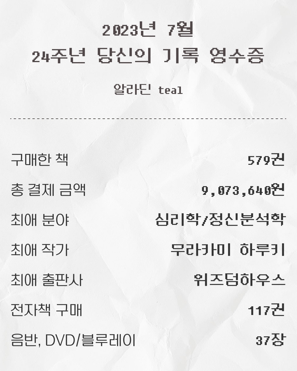 알라딘 24주년 기념으로 독서 통계를 내준다. 주로 알라딘을 많이 이용해와서 그래도 여기서 많은걸 볼 수 있는 듯!