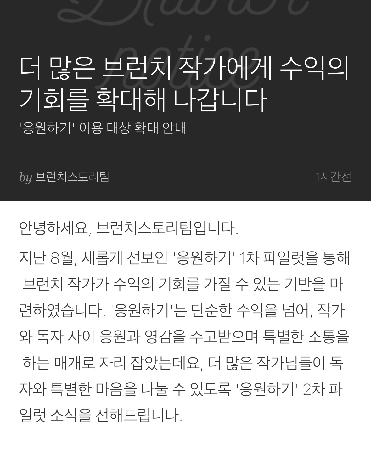 이제 브런치 플랫폼에서 응원하기 기능을 통해 수익 창출도 가능한 스토리 크리에이터가 되었네요. 연재도 가능하다고 하는데 어떻게 사용하면 좋을지 고민해 봐야겠어요. 하반기엔 글 작업을 많이 하게 될 것 같아요.