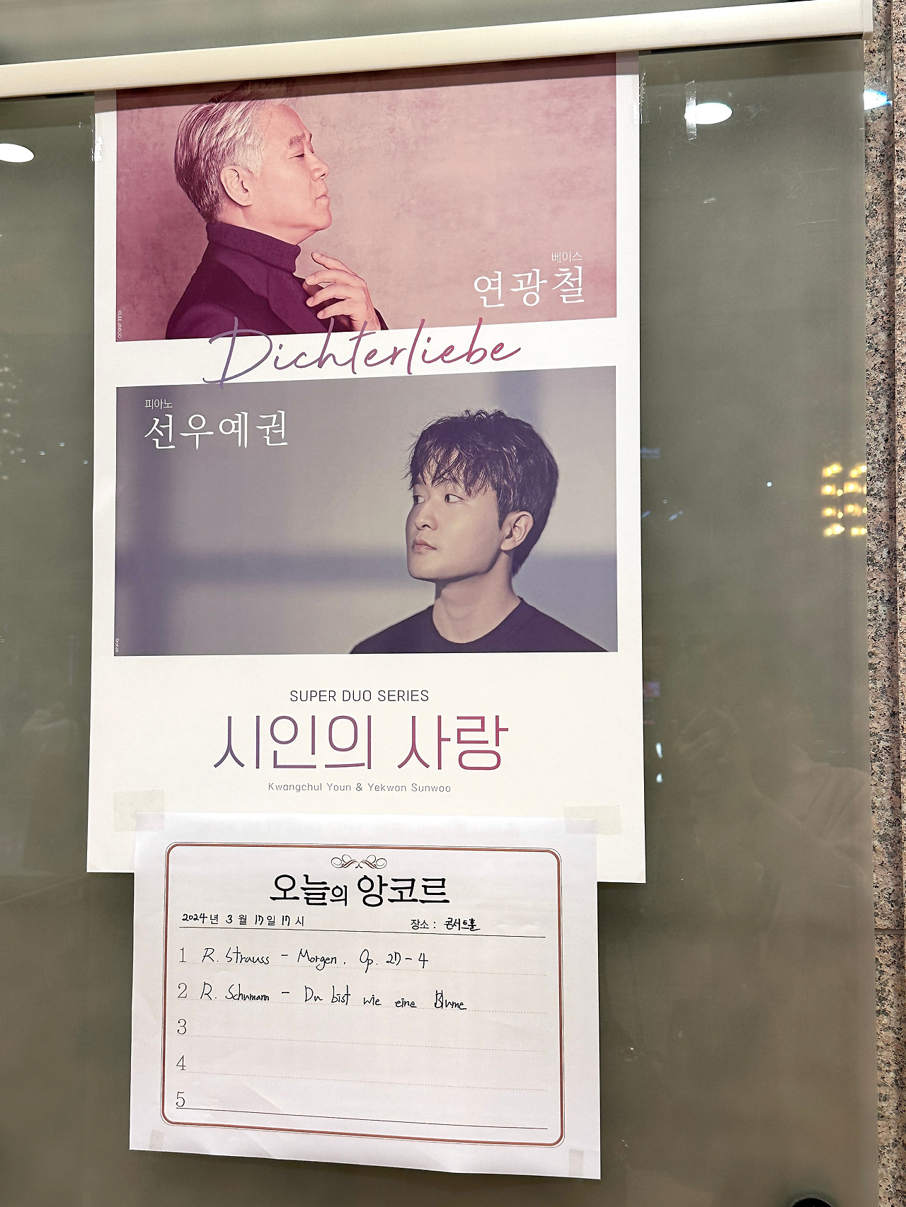 예권님의 솔로 앵콜곡은 슈트라우스의 Morgen (내일) 이었는데 왠지 가장 서정적인 느낌이라 오늘 공연에서 제일 좋았다. 그리고 가곡 가사들이 시라서 참 아름다운 내용들이 많다는 생각을 다시 하게 되었다.