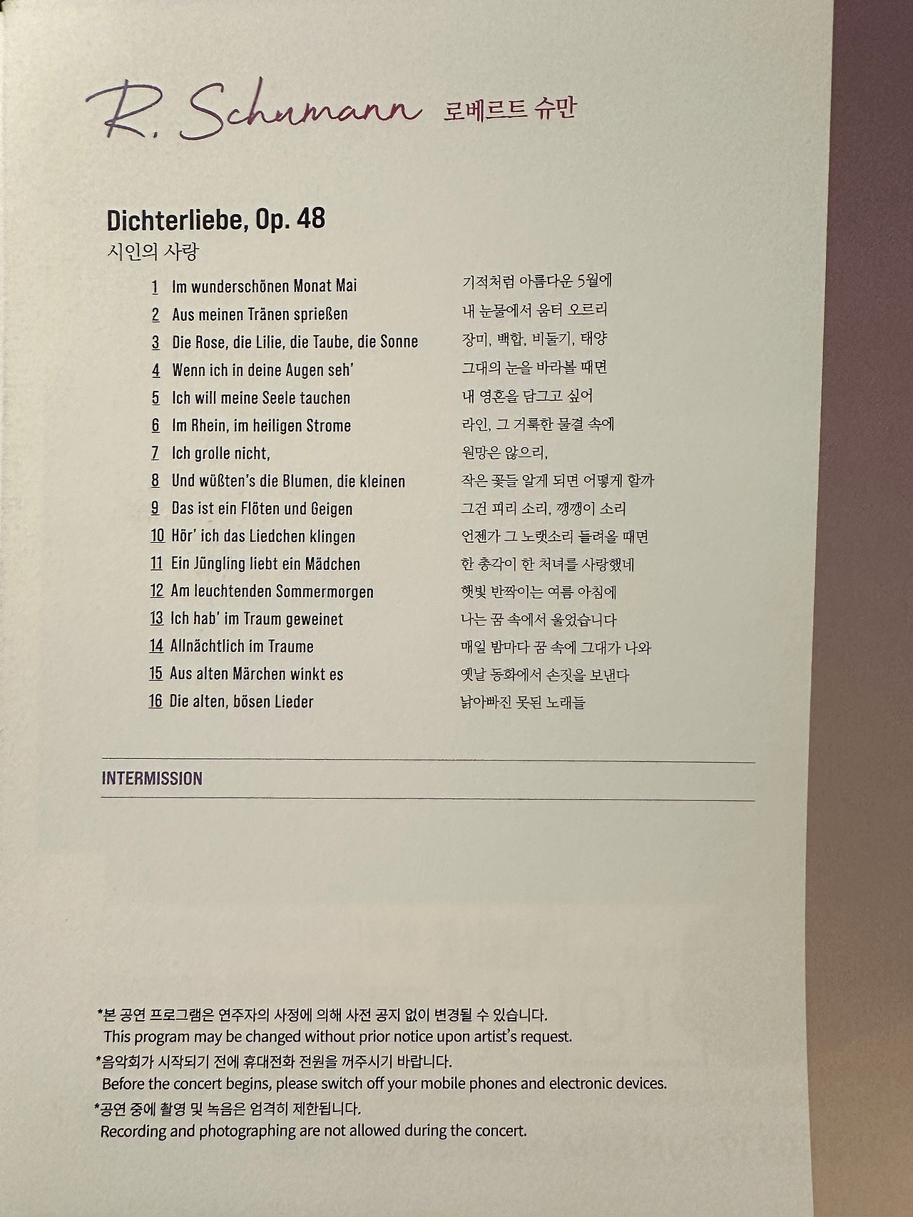 이번 선우예권님과 연광철님의 공연, “시인의 사랑“은 예전 선우예권님의 리사이틀 ”나의 클라라“에 이은 ”그녀의 슈만“ 같은 느낌이었다. 예권님의 앵콜곡을 제외하고는 모두 슈만의 곡이었어서 왠지 더 그런 것 같다.