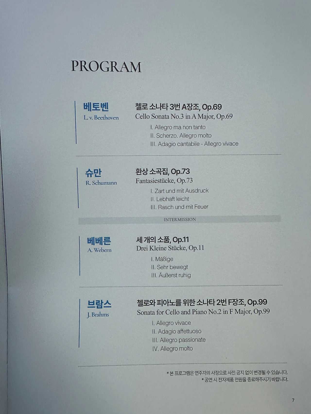 프로그램은 클래식 하면서도 컨템포러리가 살짝 들어가있는 꽤 밸런스가 좋았던 공연이었다. 베토벤, 슈만, 브람스의 곡들이야 뭐 어떤 악기로 들어도 좋은 곡들이 많고..