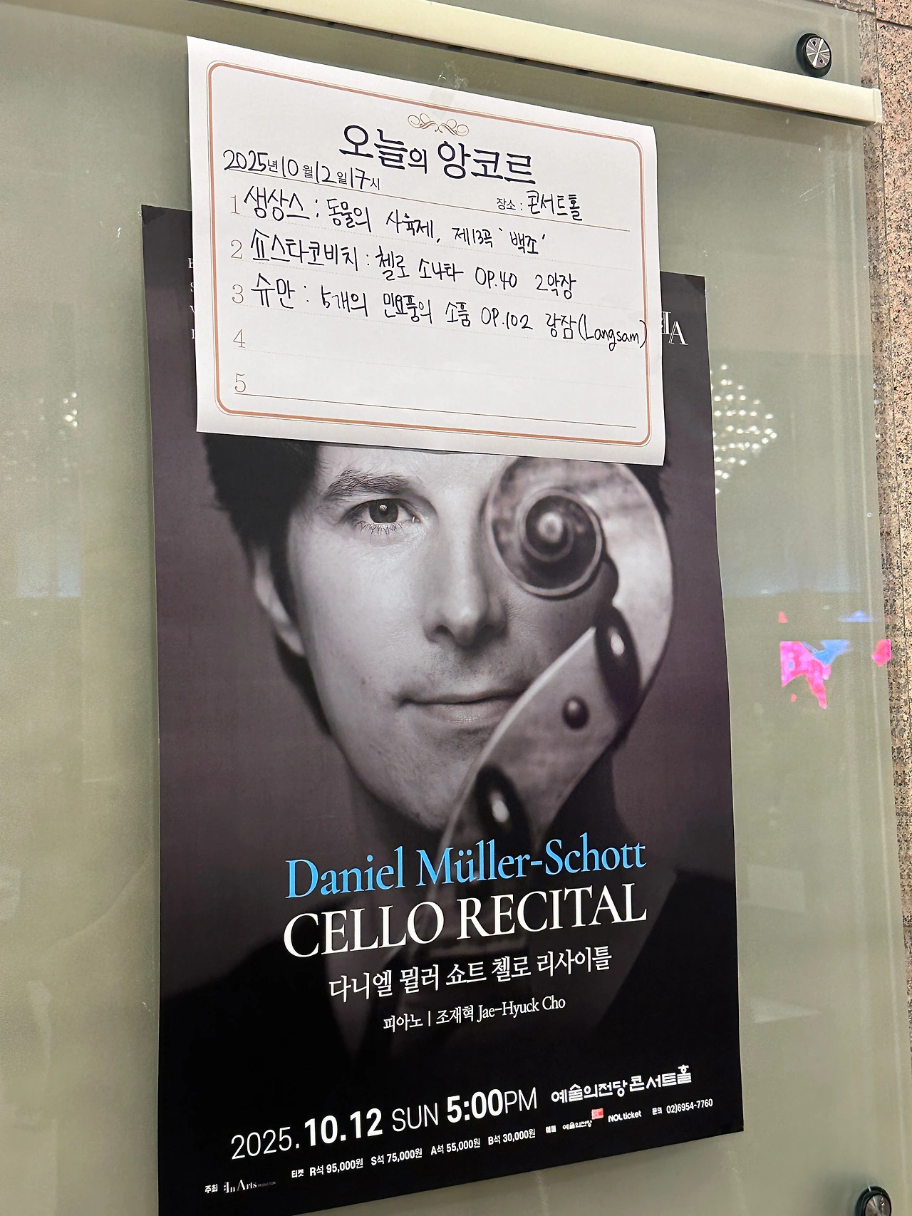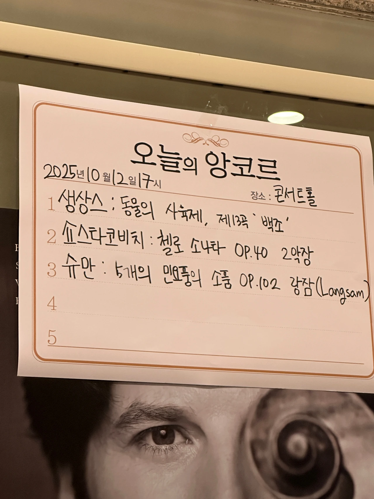 보다 자유로운 분위기로 이어진 앵콜곡은 더 좋았다. 익숙한 멜로디의 쌩상스 동물의 사육제 중 백조, 쇼스타코비치 첼로 소나타, 슈만의 랑잠을 들려주셨는데 내 원픽은 쇼스타코비치! 첼로에서 이렇게 다채로운 사운드를 들려주다니 역시 분위기 최고였다.