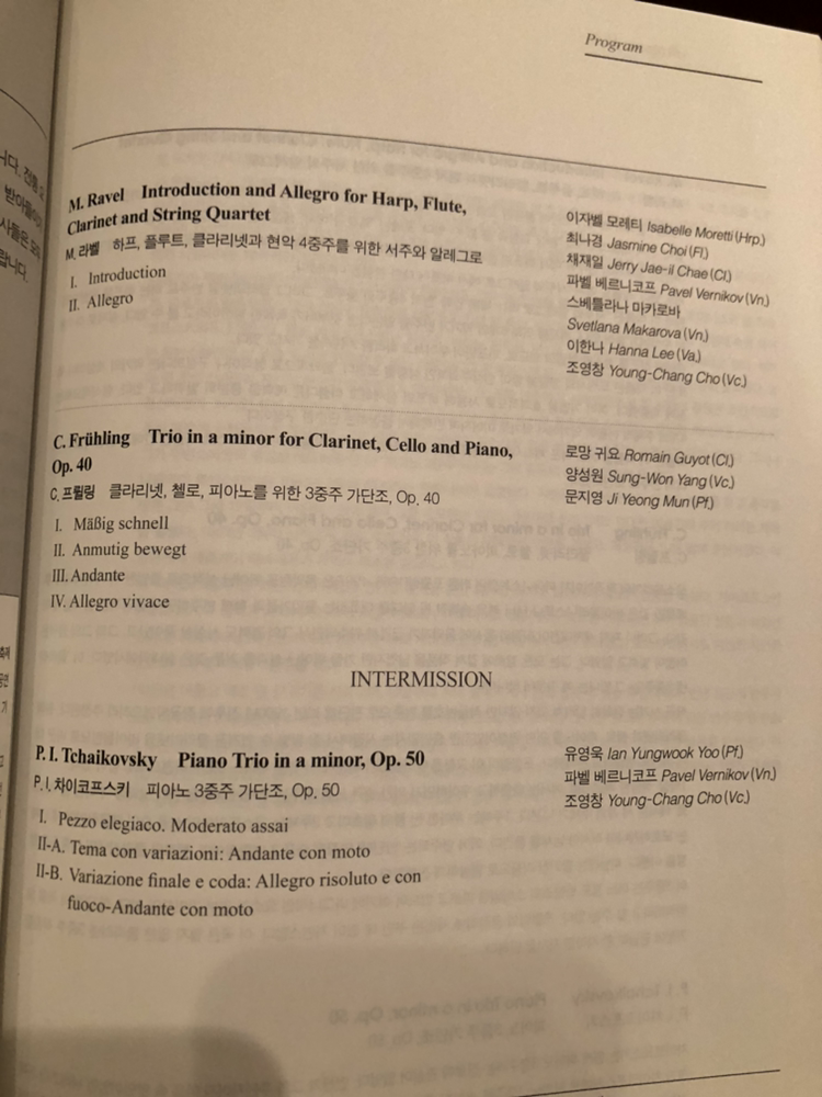 세번째 차이코프스키 곡은 크게 기대 안했는데 굉장히 좋았다고 해야할까. 한국의 베토벤이라는 칭호가 괜히 붙은게 아닌것 같은 유영욱 피아니스트의 연주는 유려하면서도 격정적이었다. 파벨 베르니코프의 바이올린 연주 역시 신들린 듯 하였고 그의 과다니니 소리는 이 세상 소리가 아닌 듯 하였다. 조영창 첼리스트님은 섬세하고 집중력 있는 연주를 보여주셔서, 세 분이 정말 멋진 협연을 보여주셨다.