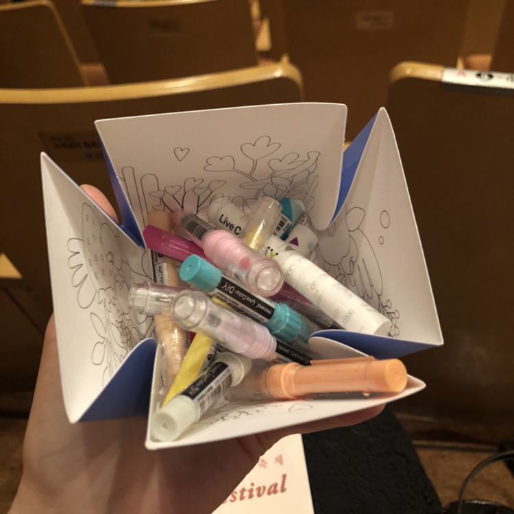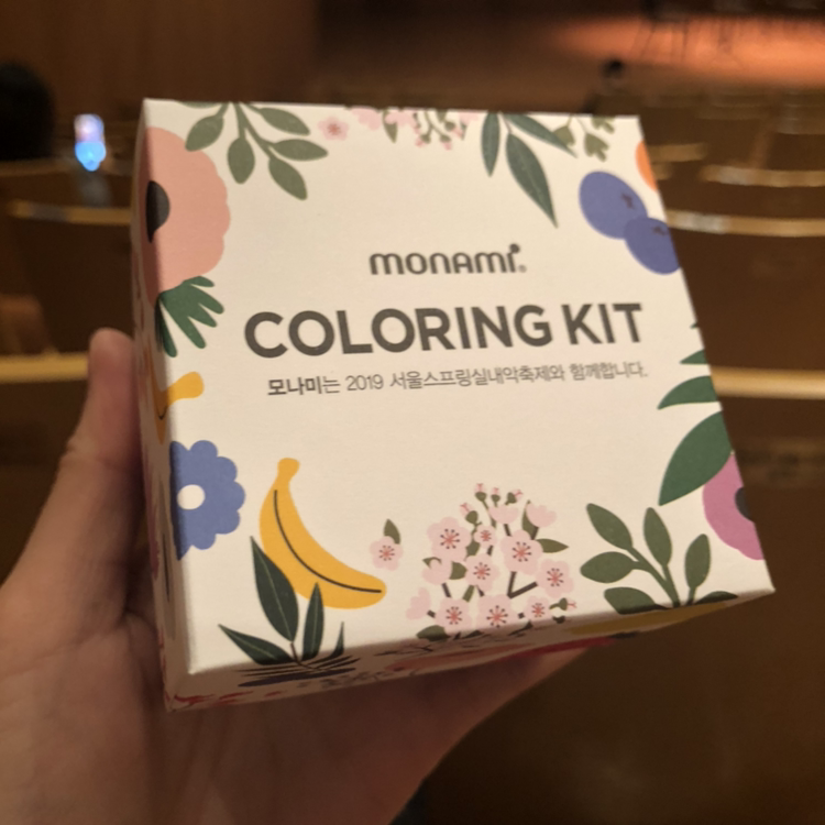 오늘 공연에는 데일리 스폰서가 있었는데 바로 모나미였다. 심지어 컬러링 키트까지 만들어서 모든 관객들에게 나눠주기까지 하여서 좋았다. 꼬마 컬러펜들 들어있고 나중에 써봐야지. 안그래도 요즘 펜 사모으기에 또 관심이 높아져서 자제하는 중인데. 한국 펜들은 아직까지는 그렇게 좋지는 않아서 모나미 같은데가 잘해주면 좋지 뭐.