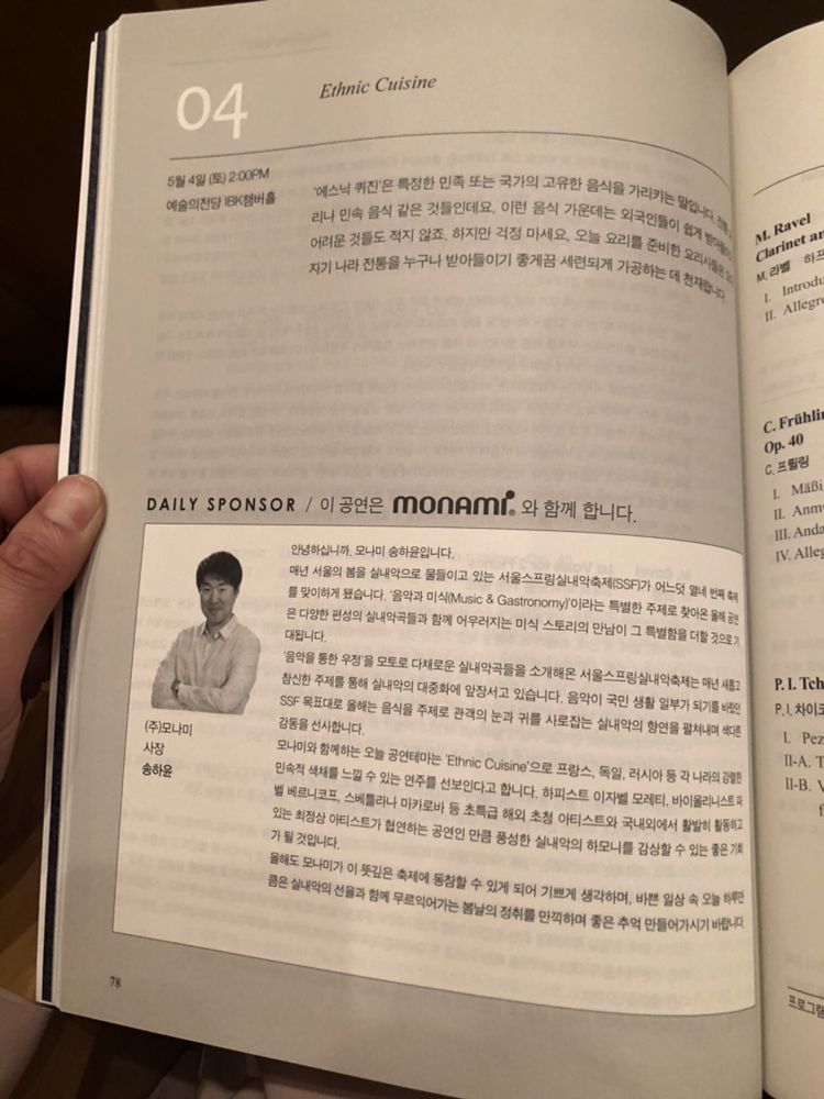 첫번째 라벨곡을 이자벨 모레티가 불어와 영어를 섞어가며 설명을 해주었는데 하프의 형태가 변한 것에 대한 설명을 해주었고 영화배우처럼 레드 스카프를 멋지게 하고 나오셨다. 하프가 메인인 구성이었고 하프라는 악기의 매력을 듬뿍 느낄 수 있었던 곡.