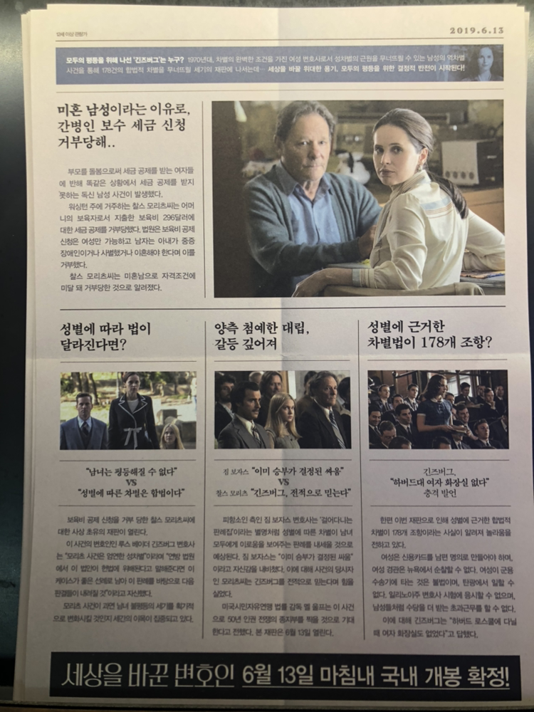 영화를 보면 다들 하는 말일테지만 남편으로 나오는 마틴 긴즈버그의 캐릭터가 너무 매력적이다. 아내와 아내의 일, 아내의 신념을 전적으로 믿어주고 지지해주는 남편은 그녀가 “급진적 사회 변화”를 이루는데 큰 도움이 되어준다. 또한 그녀의 딸인 제인은 시대에 뒤떨어진 법 빼고 다 바뀌어버린 세상을 실감하게 만들어 용기를 잃어가는 엄마에게 영감과 격려를 불어 넣어준다.