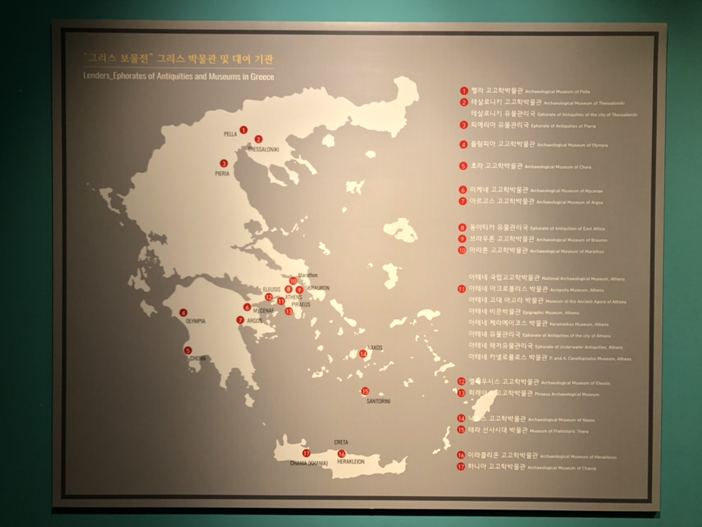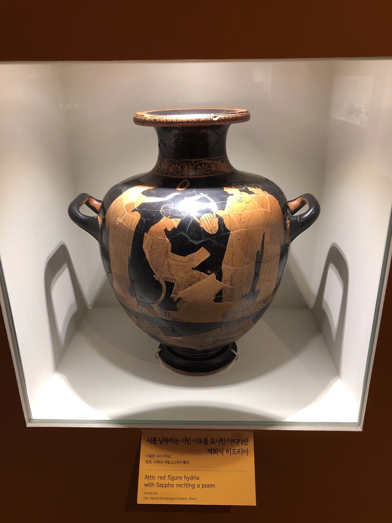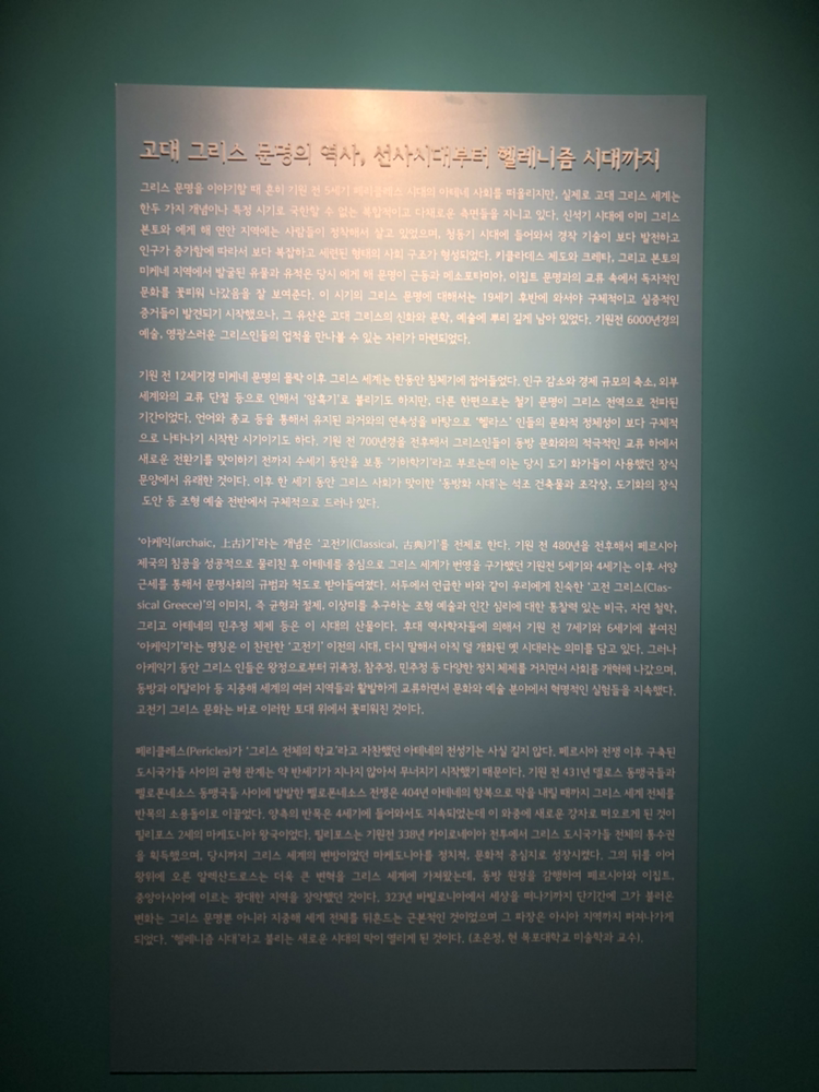 그리스 보물전은 생각보다 유물의 수가 그렇게 많지는 않았다. 하지만 전시장 내 설명판을 따라 걷다 읽다 보면 인류 역사의 중요한 현장/시기에 대해 다시금 생각해 볼 기회가 된다. 이번 기회에 좀 새롭게 다가왔던 것은 그리스 신화가 생각만큼 오래된 것은 아니라는 것 (기원전 6세기), 그리고 그리스 민주정 아테네 도시국가 체제가 그로 인해 얼마 있다 생긴 거 라는 거 (기원전 5세기).
