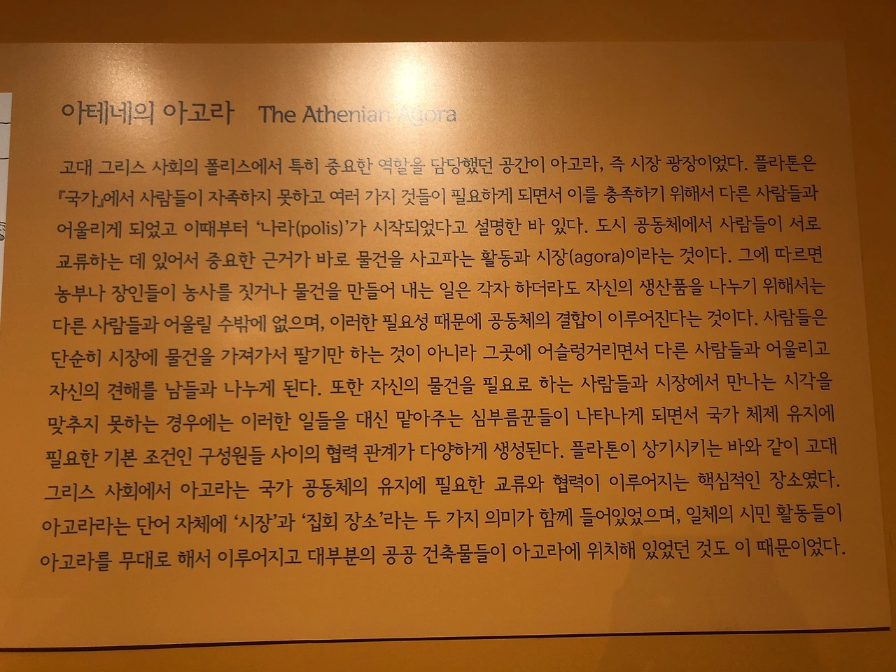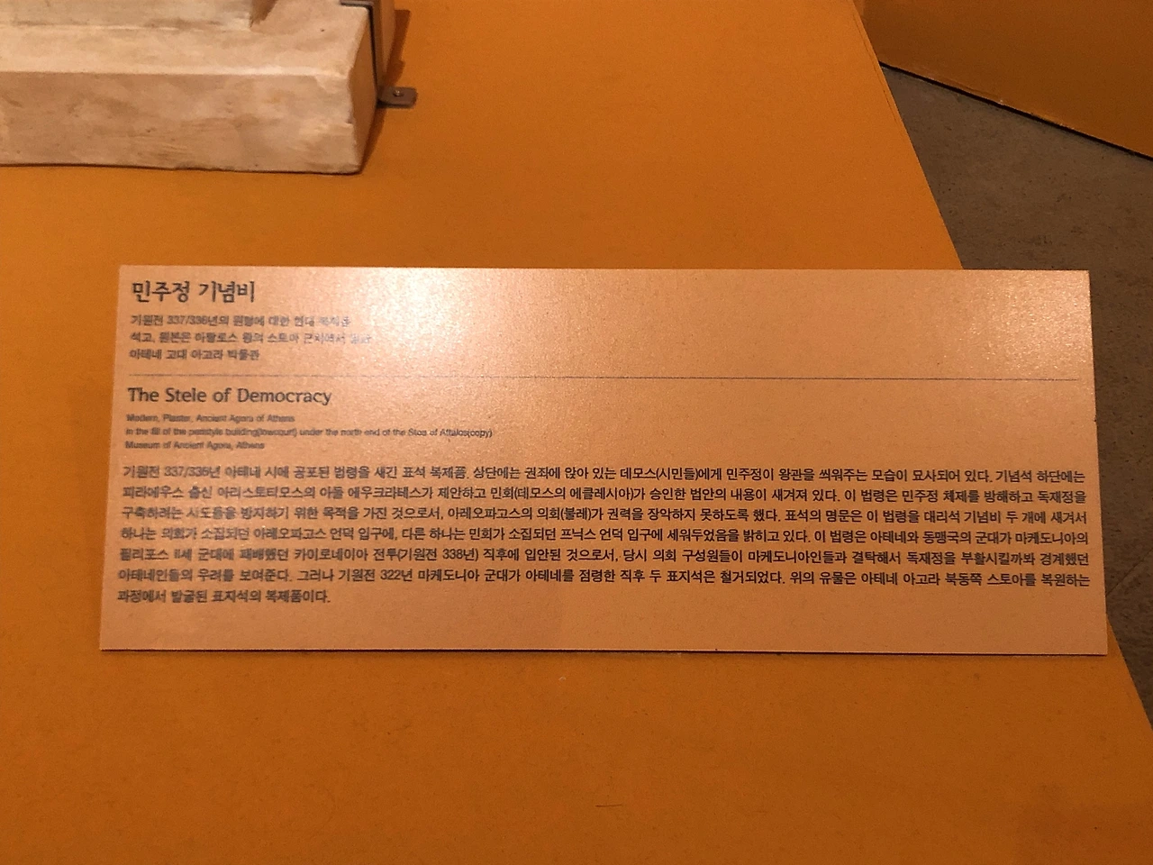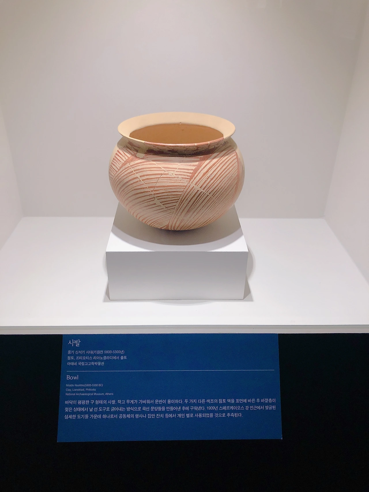 그리스 보물전은 생각보다 유물의 수가 그렇게 많지는 않았다. 하지만 전시장 내 설명판을 따라 걷다 읽다 보면 인류 역사의 중요한 현장/시기에 대해 다시금 생각해 볼 기회가 된다. 이번 기회에 좀 새롭게 다가왔던 것은 그리스 신화가 생각만큼 오래된 것은 아니라는 것 (기원전 6세기), 그리고 그리스 민주정 아테네 도시국가 체제가 그로 인해 얼마 있다 생긴 거 라는 거 (기원전 5세기).