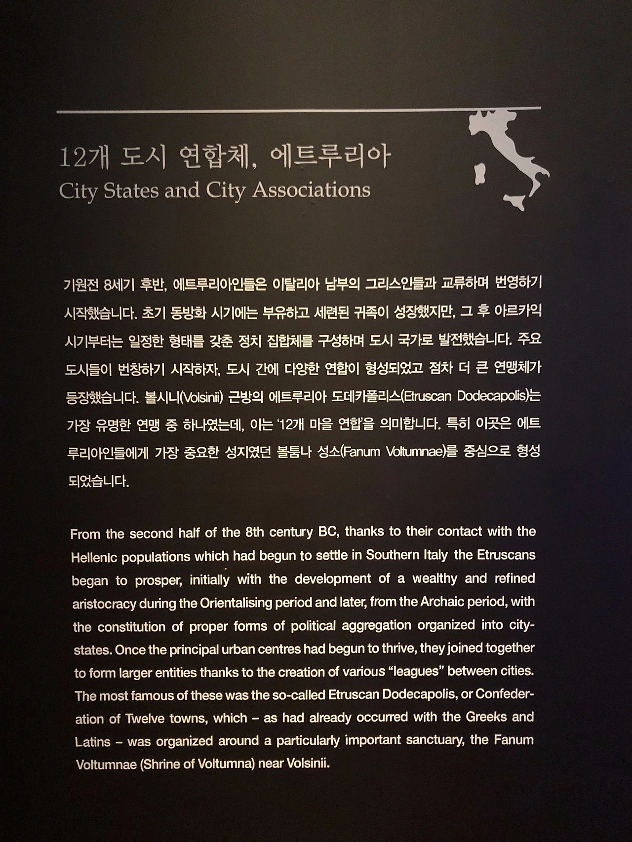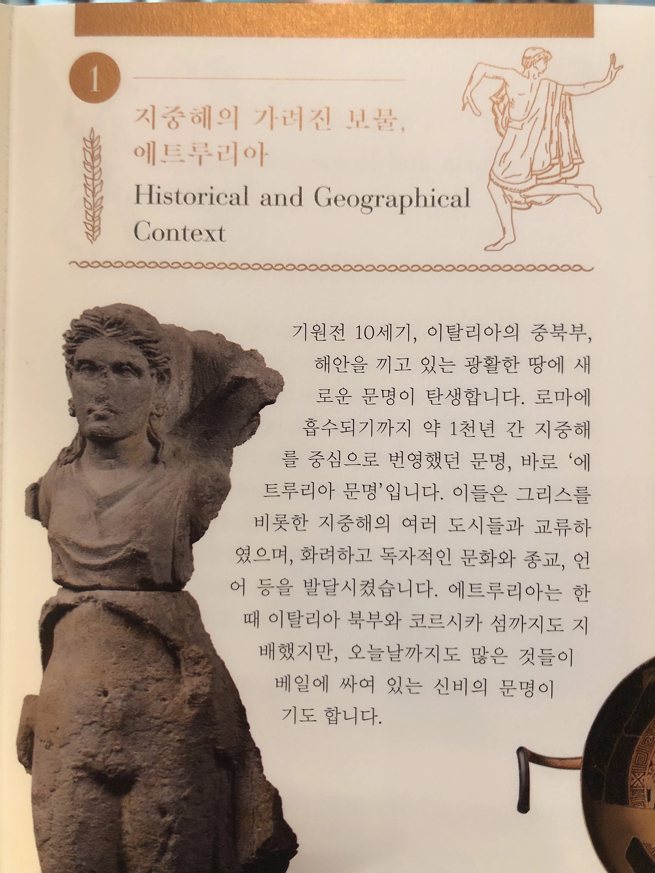 에트루리아는 기원전 900년부터 기원전 100년까지 존재하였으며 그리스와 함께 로마에 깊은 영향을 준 나라라고 한다. 그리스가 도시 국가 체제를 갖출 무렵인 기원전 6세기경 이탈리아 중북부 지역에서 (지금의 피렌체를 주도로 하는 토스카나 지방) 우수한 문화를 꽃피웠다가 기원전 3세기경부터 서서히 로마에 흡수된다.
