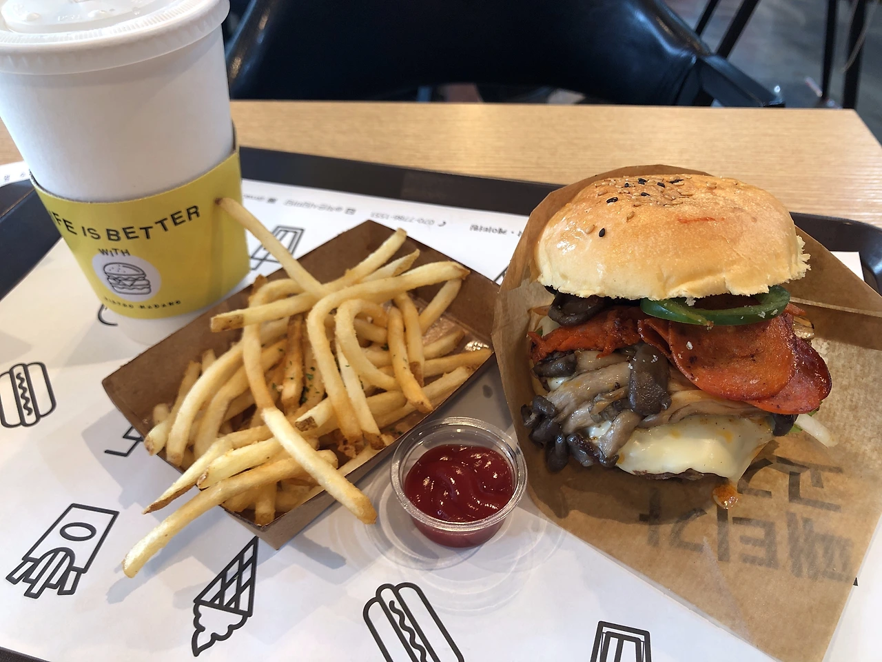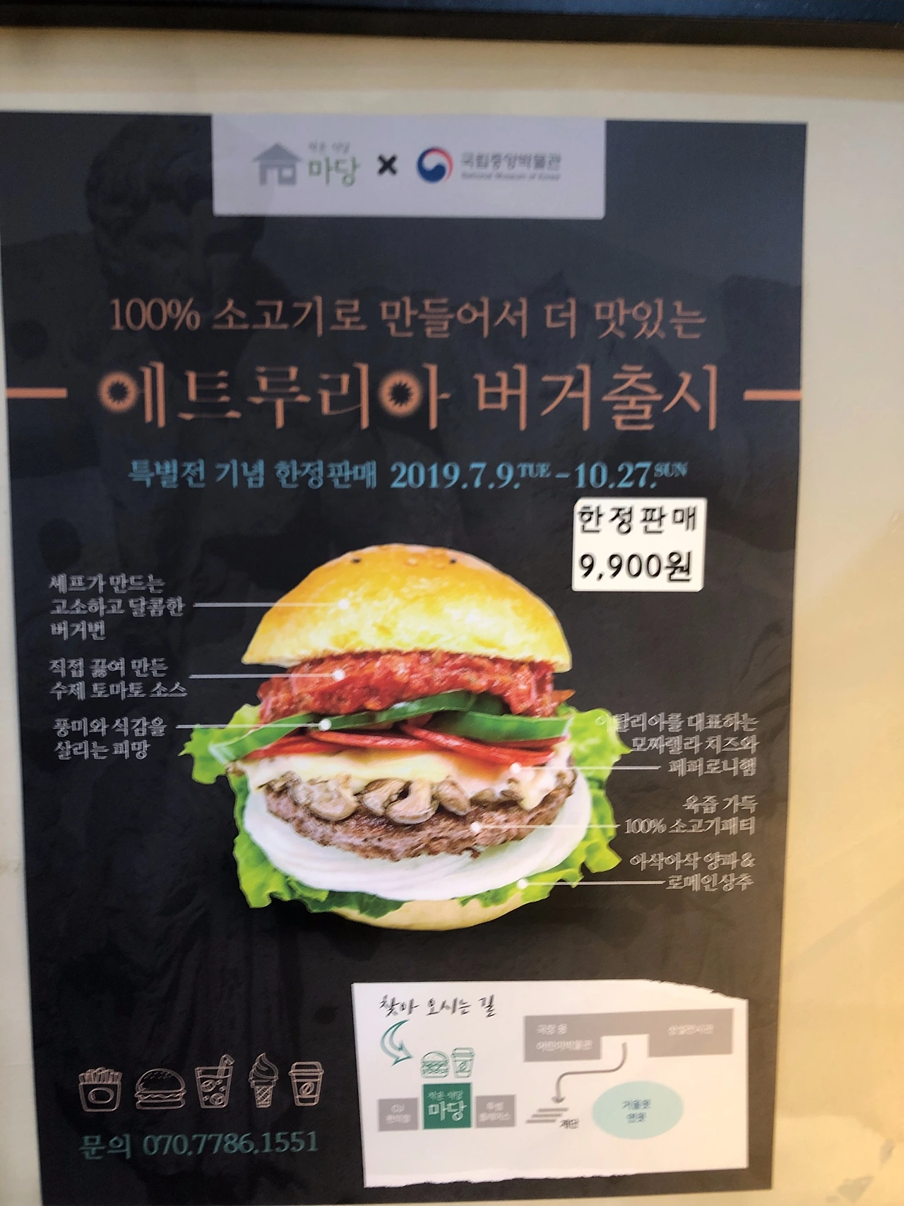 요즘 에릭 요한슨이나 데이비드 호크니, 베르나르 뷔페 같은 인기 전시에 가면 전시 굳즈 사고픈 게 많아서 힘겨웠는데 에트루리아 전은 특이하게 “에트루리아 버거”를 판다! 20분 정도 기다리긴 했지만 셋트로 에트루리아 수제 버거 먹었는데 뭔지 모르게 뿌듯. 이것도 꽤 괜찮은 아이디어 아닌가 싶다. 전시 굳즈가 아닌 메뉴. 국립중앙박물관은 전시 연계 메뉴들을 식당들에서 자주 팔곤 하는 것 같더라.