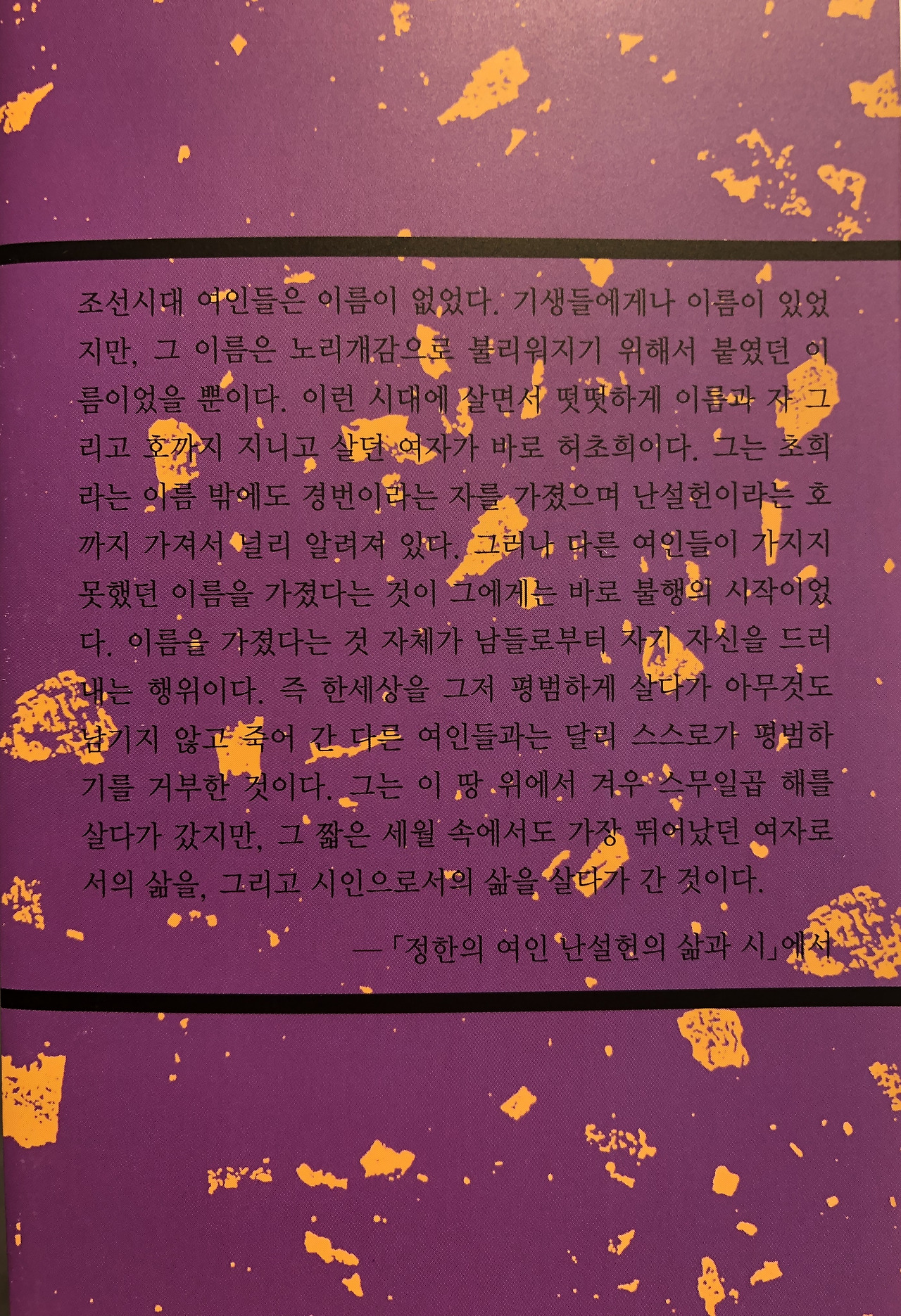 소설 <난설헌> 다 읽고 이제 <허난설헌 시선> 읽기. 여아인지 남아인지 태아를 감별하는 것이 지금까지도 기승을 부리는 한국과 같은 나라이지만, 조선 시대에 여성들은 태어난 이후에 이름조차 가지지 못했다. 그러던 시대 이름과 호를 가졌던 이가 바로 허난설헌이다.