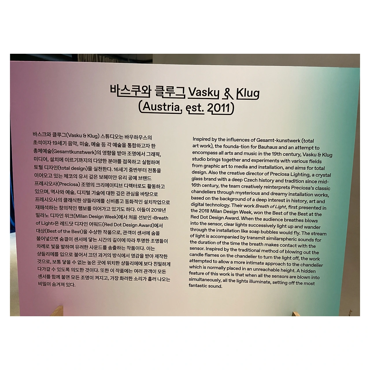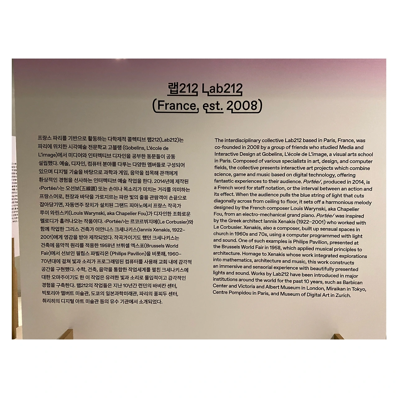 바스쿠와 클루그의 입으로 부는 샹들리에 설치작과 Lab212 의 공간 인터랙티브 피아노 퍼포먼스 작품이 상당히 인상적이었다. 그 외에 스피커로 만든 꽃 인스탈레이션이나 자연 힐링 ASMR 체험 작품도 매우 좋았다.