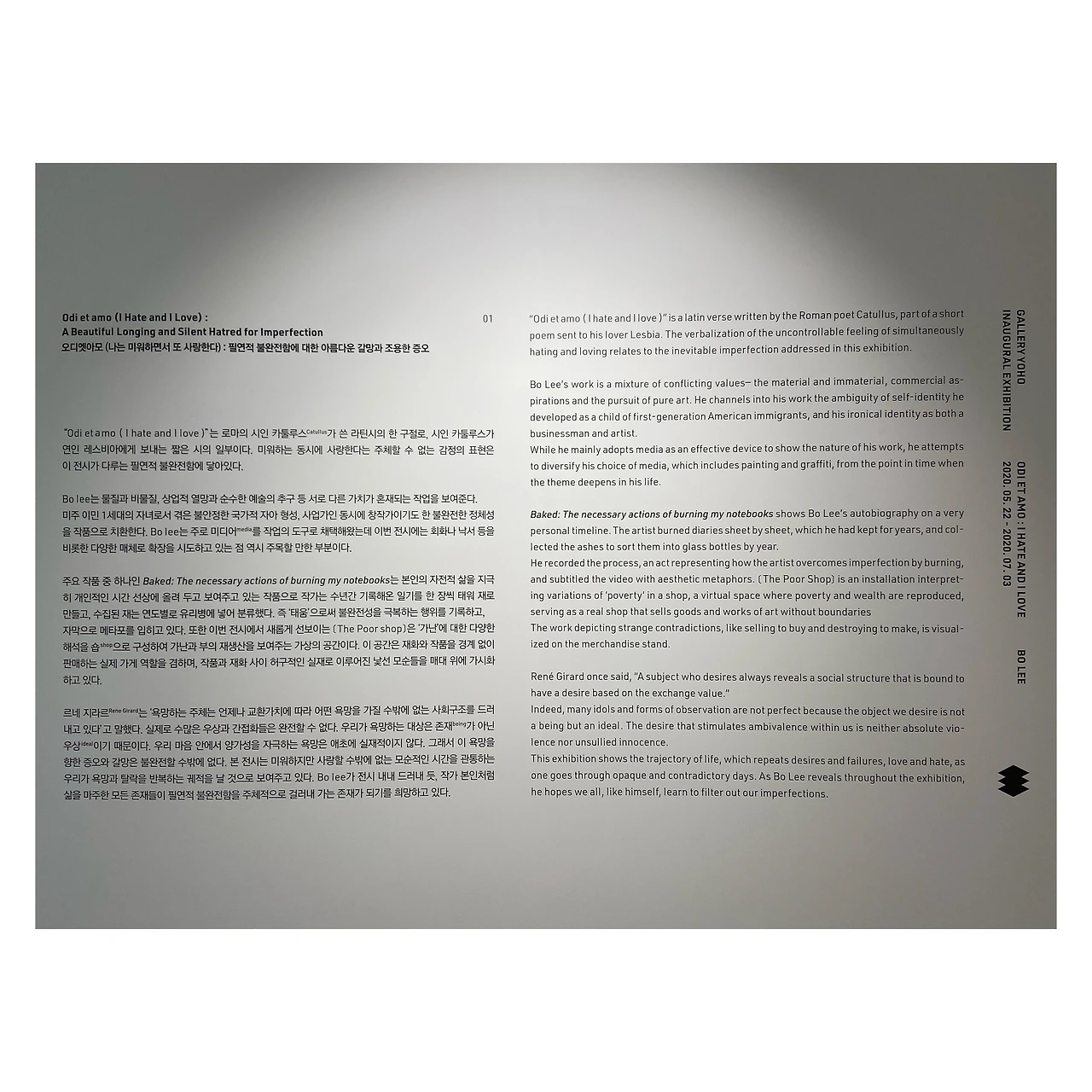 "Odi et amo (I hate and I love) 는 로마의 시인 카툴루스가 쓴 라틴시의 한 구절로, 시인 카툴루스가 연인 레스비아에게 보내는 짧은 시의 일부이다. 미워하는 동시에 사랑한다라는 주체할 수 없는 감정의 표현은 이 전시가 다루는 필연적 불완전함에 닿아있다"
