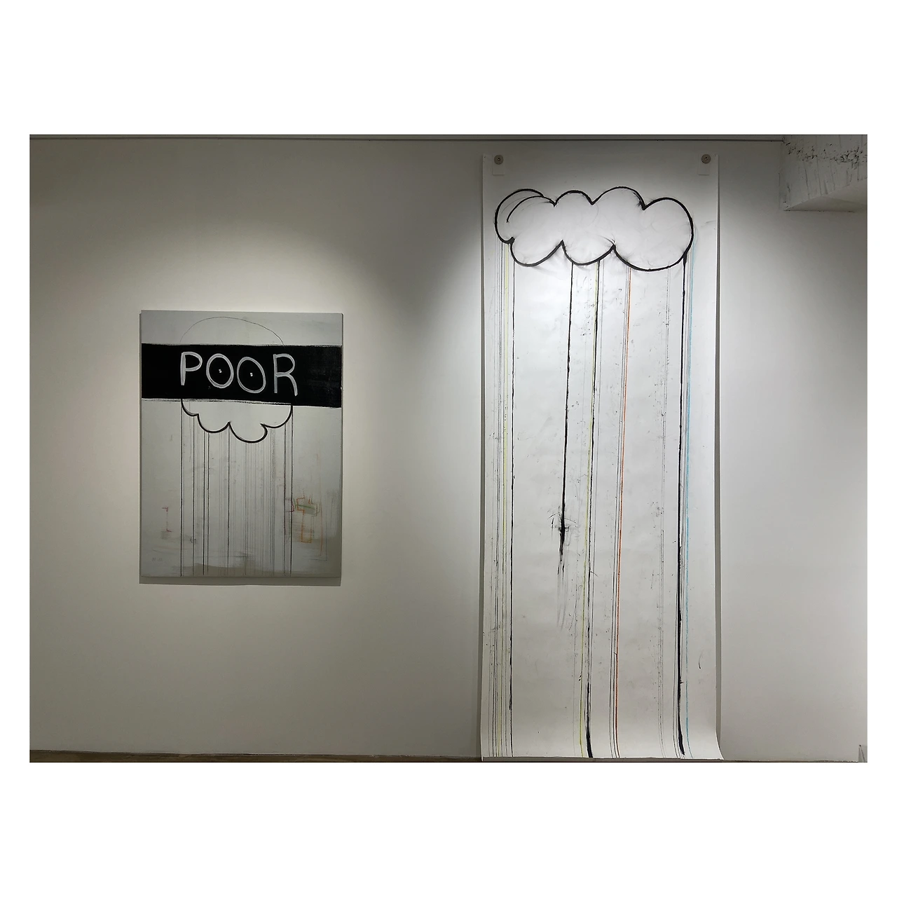 그렇지만 전시를 보다가 Poor 라는 글자가 새겨진 구름들이 자꾸 눈에 띄었다. 발음이 비슷한 Pour (소나기, 소나기가 쏟아지다) 를 연계한 이미지인 것 같다. 뭔가 간결하지만 메세지 전달이 잘 되는 거 같아서 좋았다.