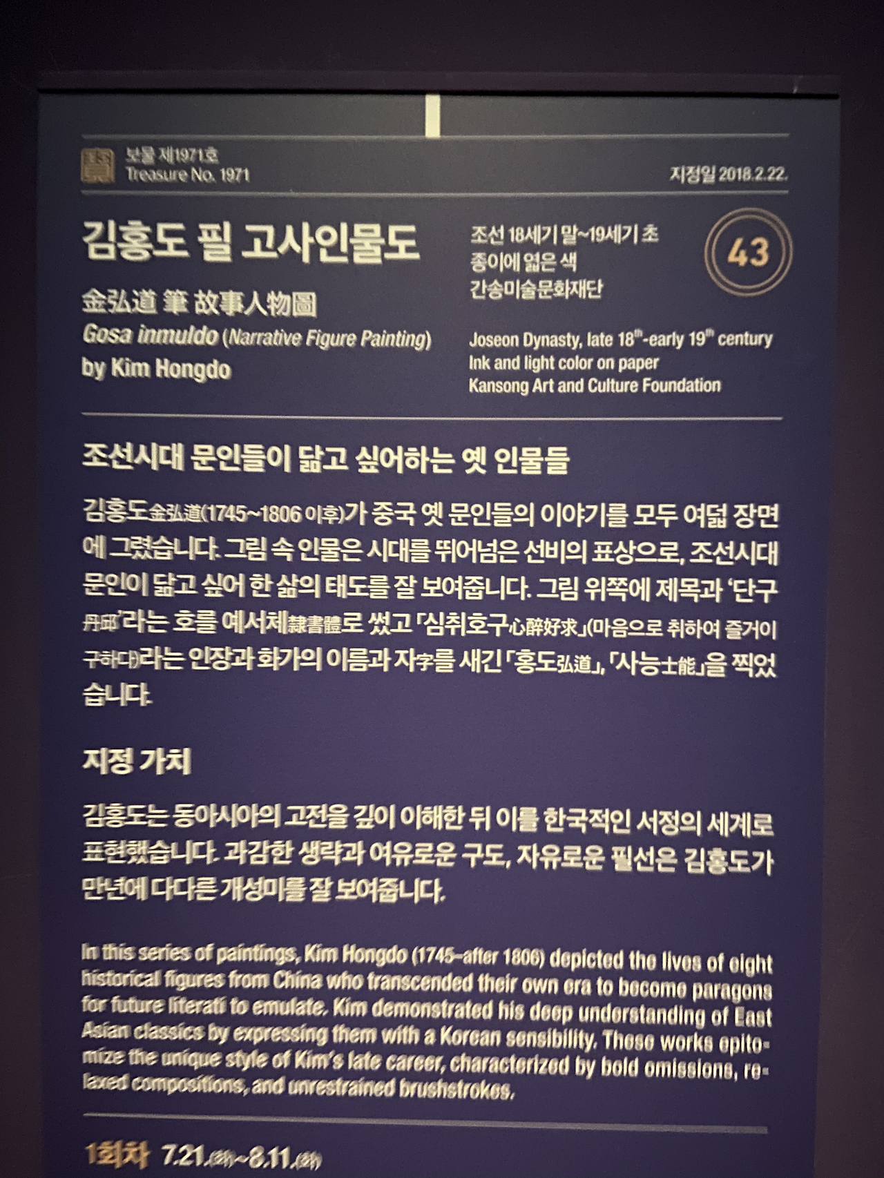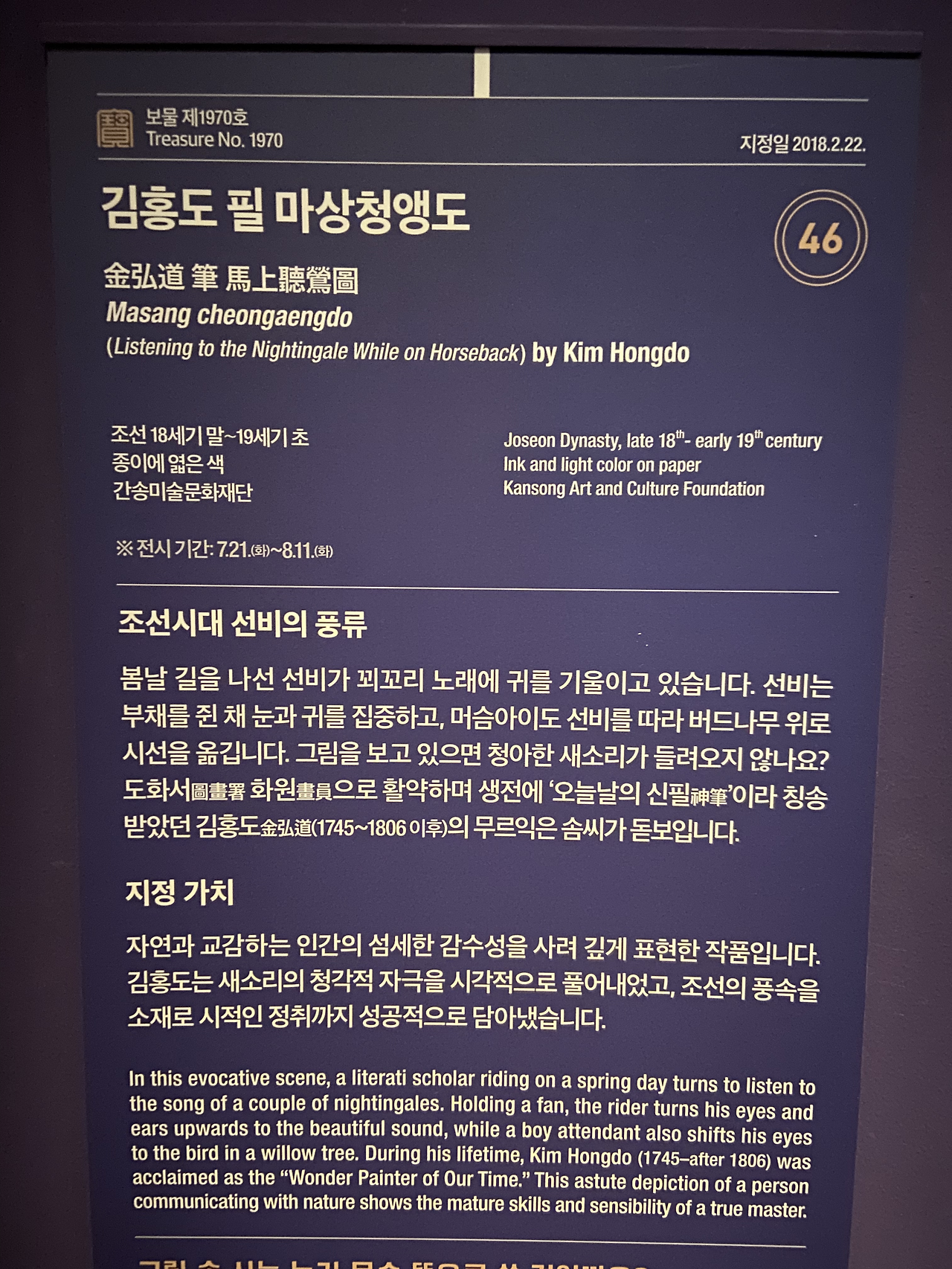 "새 보물" 전에도 역시 김홍도 작품이 있어서 너무 좋았다. 유물만 있었으면 좀 지루했을텐데 김홍도님 회화 작품들이 있어서 얼마나 반갑던지! 그리고 이런 작품들이 이제까지 보물 혹은 국보로 지정되지 않았었다는게 더 놀라울 지경이었다.