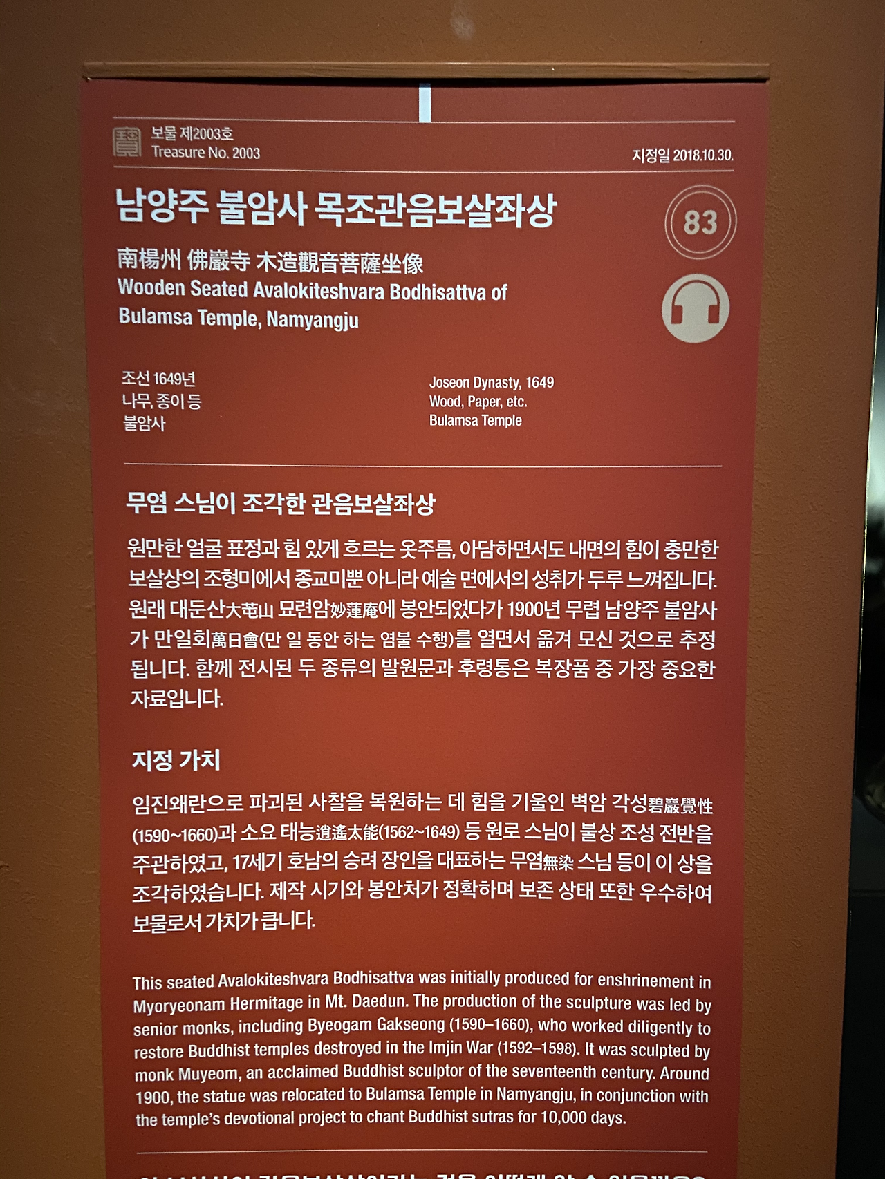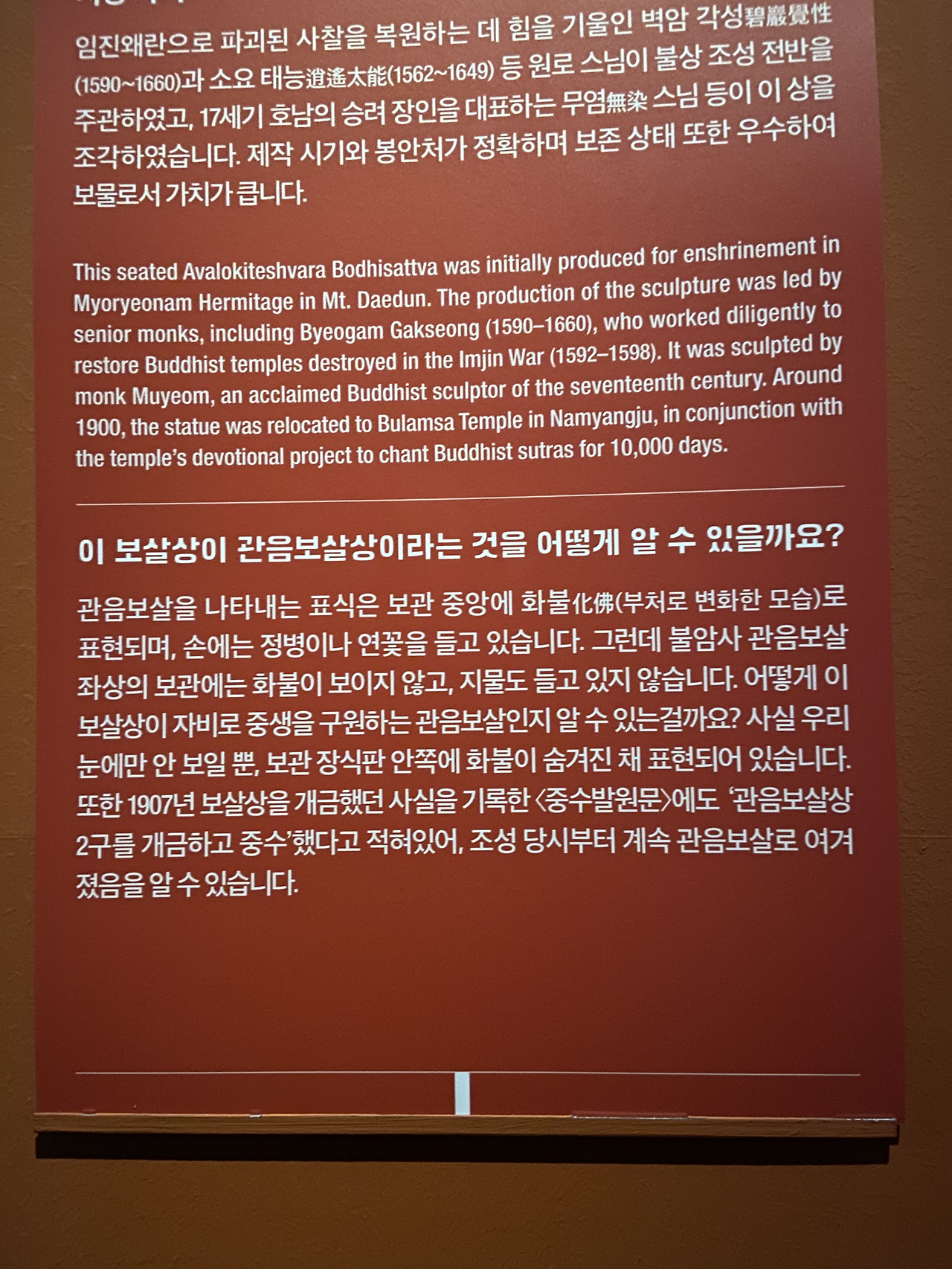 특별전에 전시되고 있는 김홍도님의 고사 인물도는 2차, 3차로 다른 작품들이 공개된다고 하니 다시 가봐도 좋을 것 같다는 생각이 들었다. 그 외에 마음에 들었던 건 "남양주 불암사 목조관음보살좌상." 정말 자애로우면서도 빛나는 모습의 관음보살상이 마음을 끌었다.