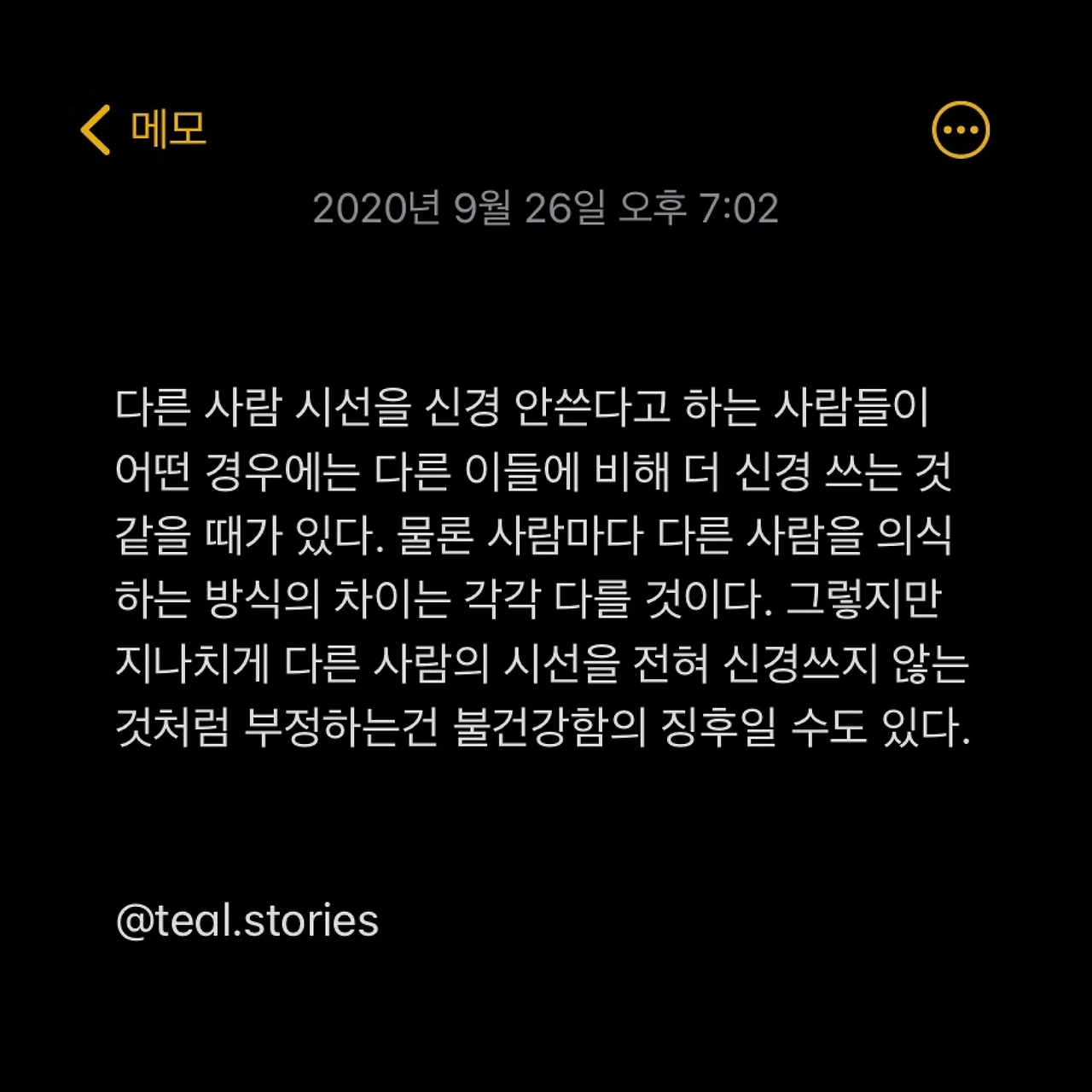 예전에는 다른 사람들 시선 신경 안쓰고 사는 사람들이 가끔 부러울 때도 있었는데 요즘에는 조금 다른 생각이 든다. 오히려 남의 시선 신경 안쓴다는 사람들이 알고 보면 더 민감하다는 느낌이랄까. 다른 형태로 숨겨져 있을 뿐이지 역시 보면 다 나름의 방식들이 있는 것 같더라. 물론 지나치게 다른 사람들의 눈을 신경쓰는 것도 불건강하다. 하지만 다른 이의 시선을 신경쓴다는 사실을 지나치게 부인하는 것도 그렇게 건강해 보이지는 않는다.