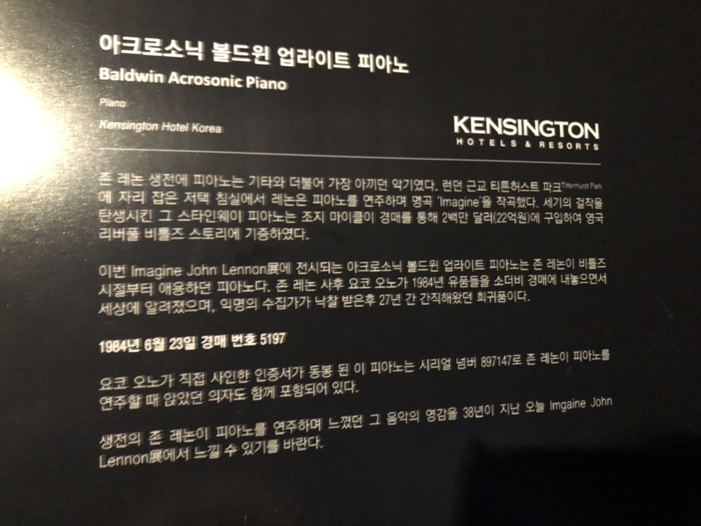 존 레논이 생전에 기타와 함께 가장 아끼던 악기가 바로 피아노인데 전시장에 그가 실제 쓰던 업라이트 피아노가 전시되어 있어서 좀 감회가 남달랐다.