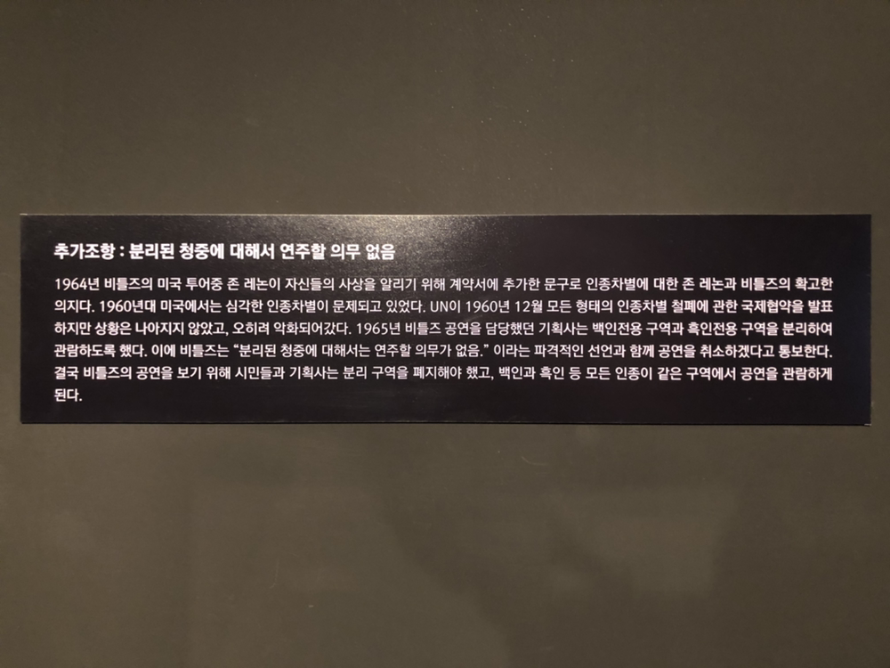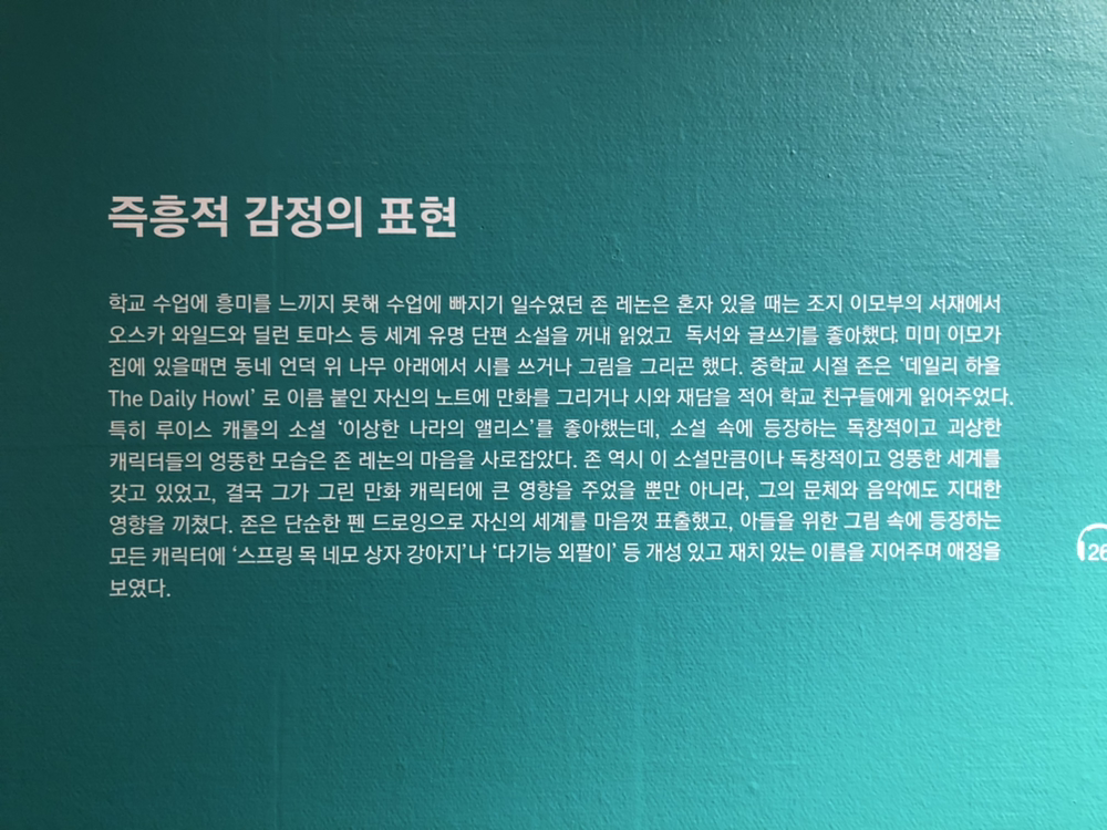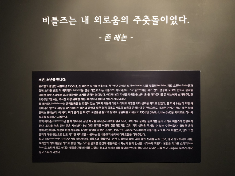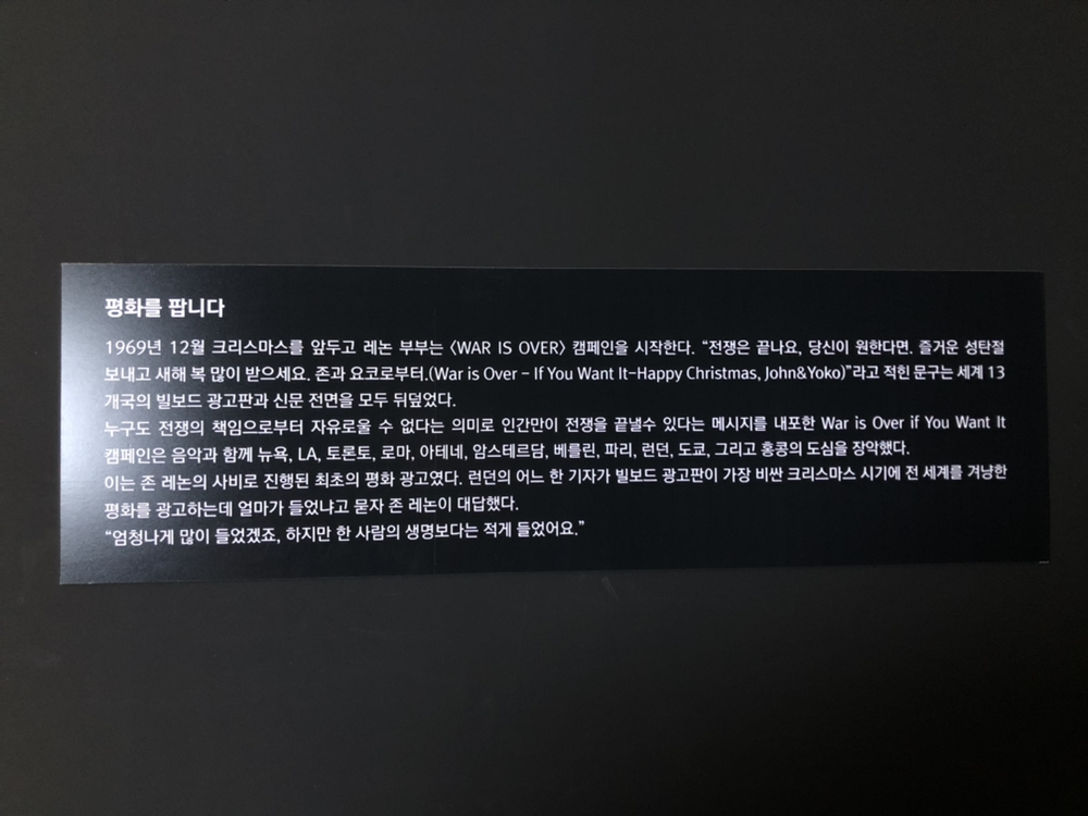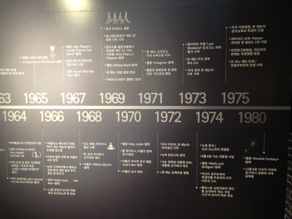 비틀즈와 존 레논에 대해 꽤 많이 알고 있기는 하지만 몰랐던 사실들도 알게 되고, 그 소란스러웠던 시절을 이 전시와 함께 다시 한번 훑어 보게 되는 느낌이었다.