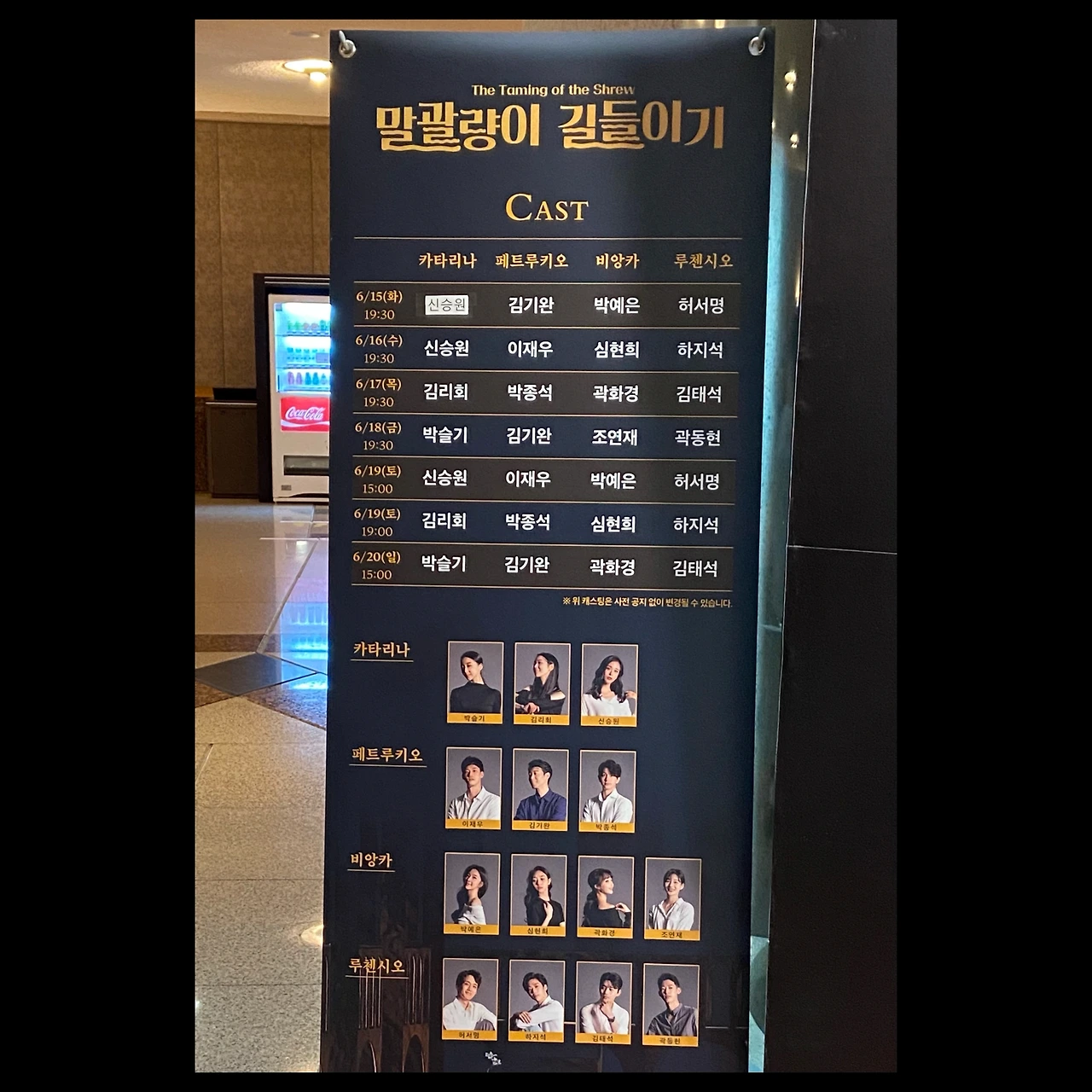 어제 새로운 발견은 주인공인 카타리나와 페트루키오를 연기한 신승원, 김기완 페어. 원래 캐스팅은 박슬기-김기완 페어였는데 슬기 리나님이 중요한 사정이 있어 캐스팅 교체가 되었다.