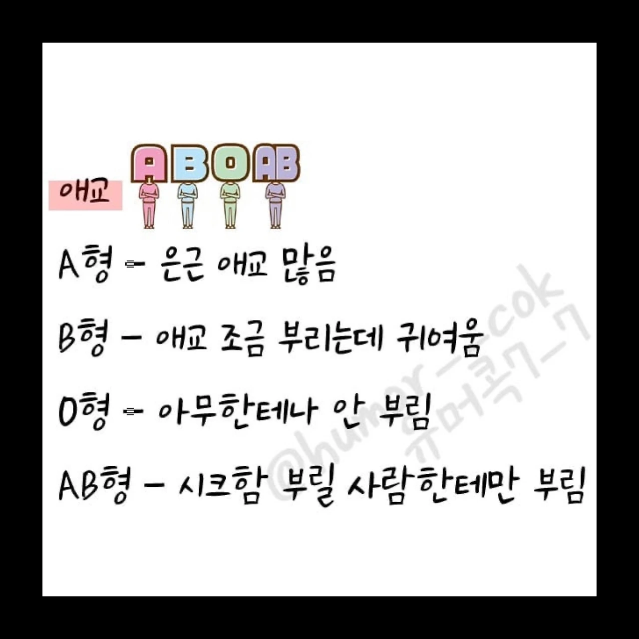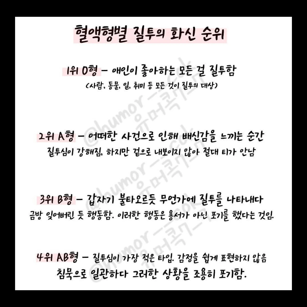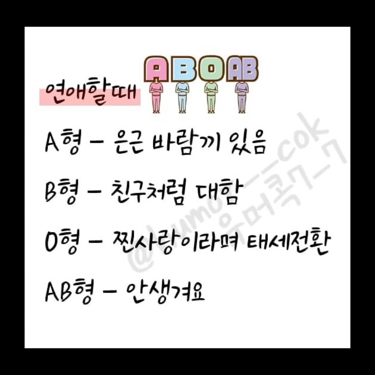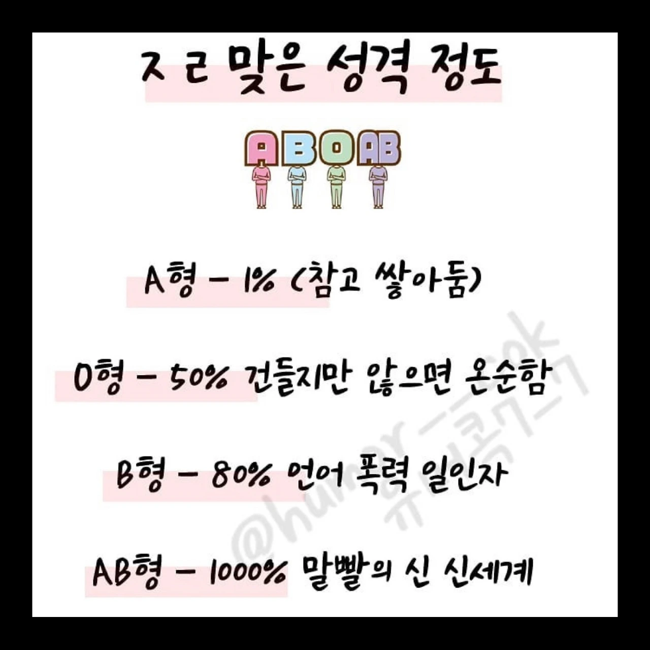 솔직히 B형, AB 형은 대충 알겠는데 나한텐 A형이랑 O형이 좀 신기함. A형은 질릴 정도로 애인한테 충성하면서 은근 바람끼가 많고, O형은 겉으로 보면 엄청 성격 좋아보이고 낙천적인거 같은데 진짜 현실적이고 경쟁 의식 장난 아닌 경향이 조금.