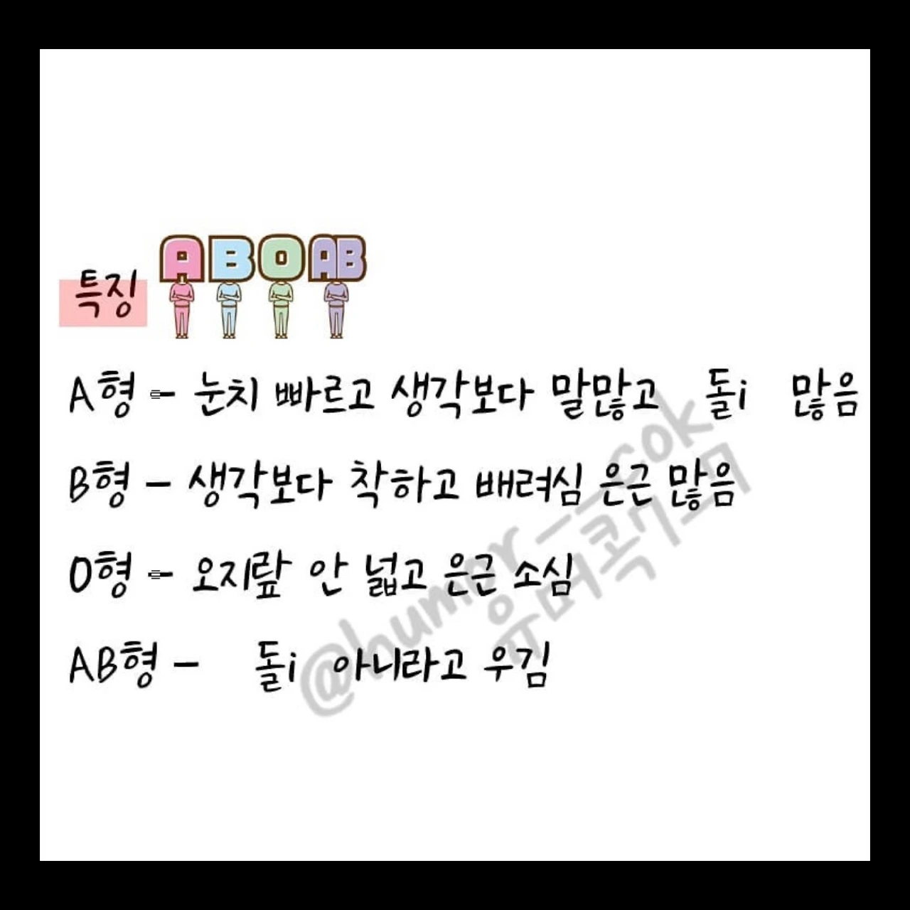 그래도 보면 O형들이 잘 사는 경우가 많다. 현실에 잘 적응하는 타입이기 때문이라 그런것 같기도. A형도 비슷한데 겉으로 순해 보이지만 알고보면 사실 성질 누구 못지 않음.