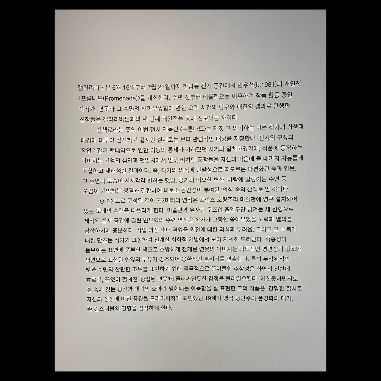 우연히 SNS 에서 발견한 빈우혁 작가의 개인전 소식. 뭔가 홀리듯이 한남동 오거리에 있는 갤러리 바톤으로 향했다.