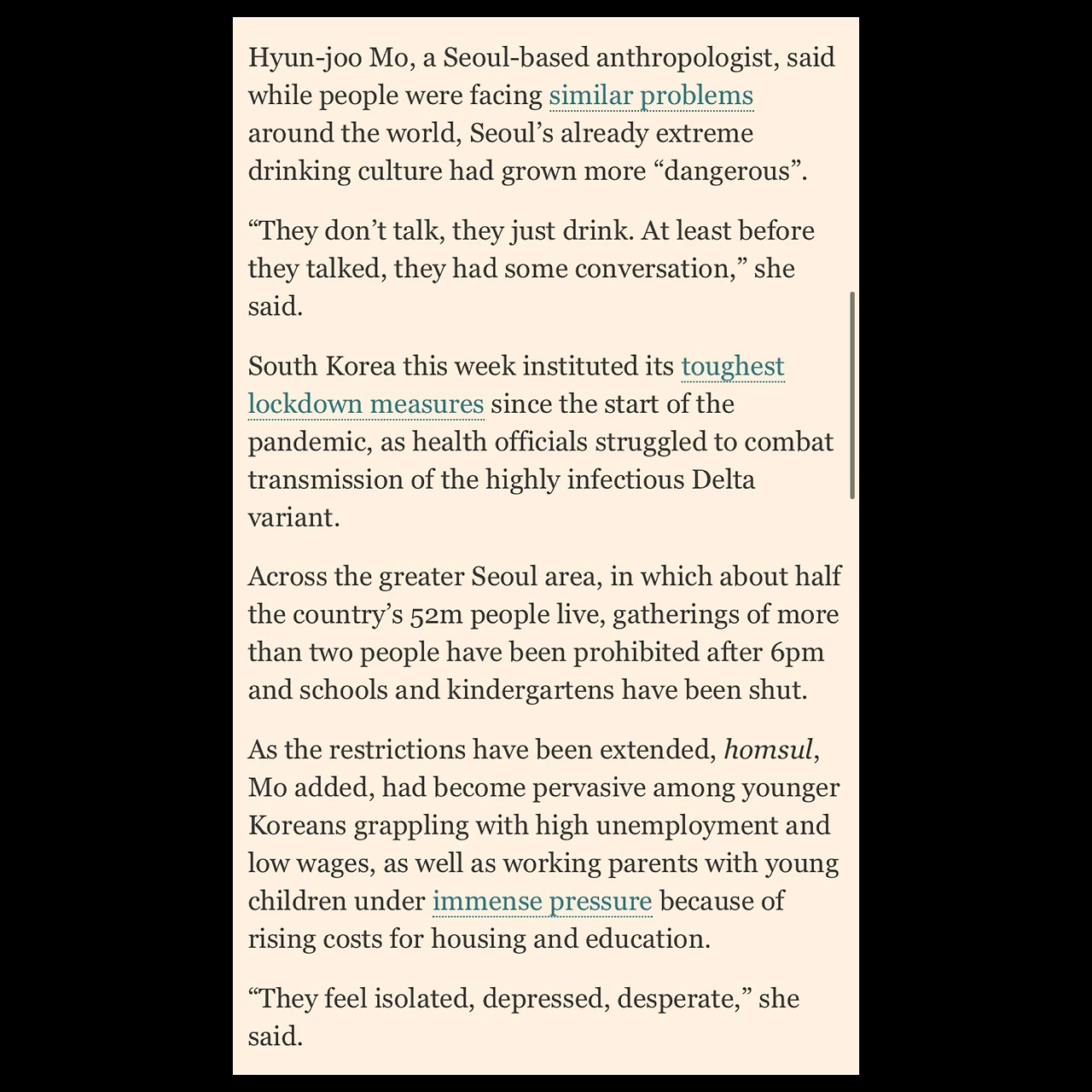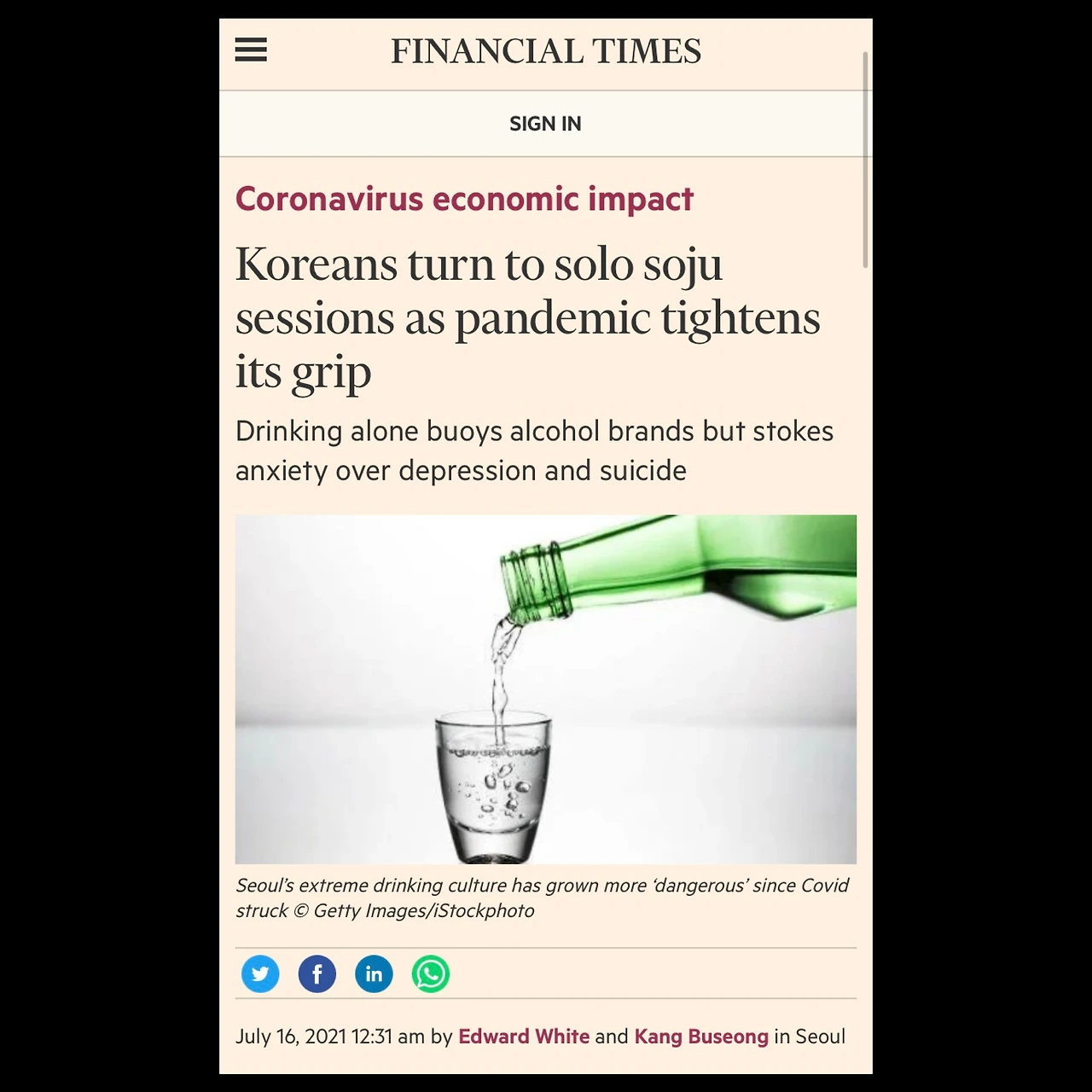 한국의 음주 문화와 최근의 혼술 증가, 청년들 사이의 우울증과 자살률 증가에 대해 파이낸셜 타임즈와 인터뷰한 기사가 떴네요. 한국에서 음주나 정신 건강에 대한 경각심이 보다 높아졌으면 하는 바램이예요..