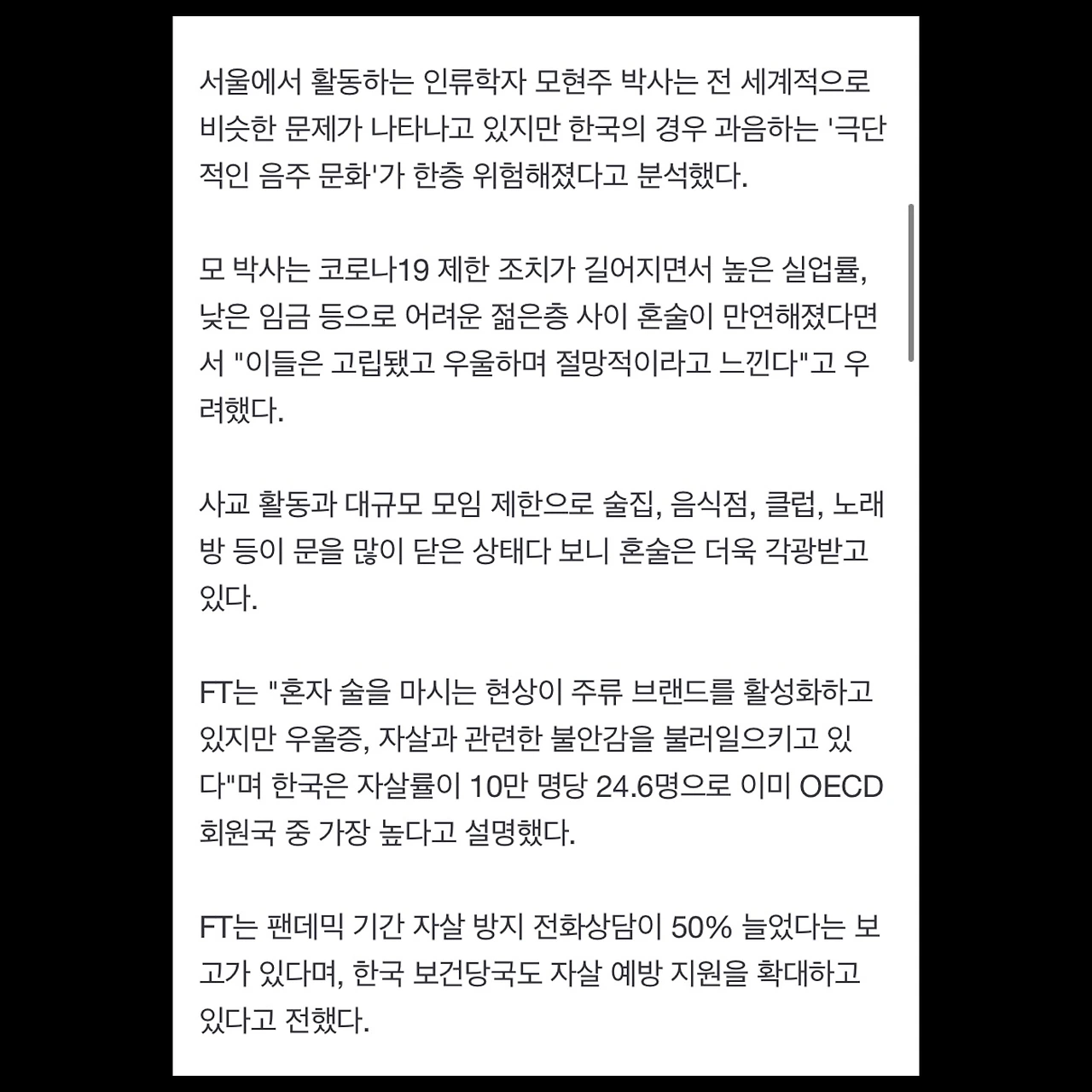 #음주 #음주문화 #술문화 #혼술 #팬데믹 #청년 #우울 #불안 #고립 #파아낸셜타임즈 #뉴시스 #인터뷰 #글스타그램 #심리 #자살 #상담