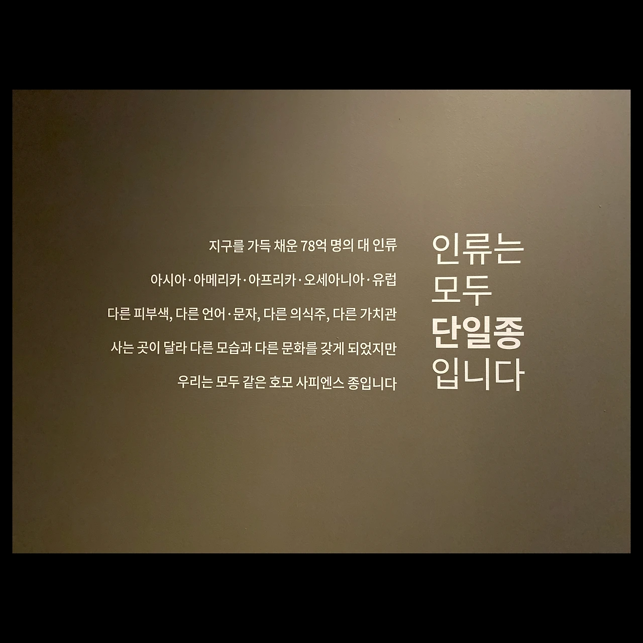 다행히 요즘에는 양심있고 상식있는 과학자, 인류학자들의 노력으로 진화론의 차별적이거나 위험한 요인들이 다소 제어되고 있는것 같다. 이 전시 역시 그러한 노력의 일환으로 느껴졌다. 현생 인류인 78억 호모 사피엔스는 모두 하나의 종이며, 생태계의 모든 존재들은 서로 연결되어 있다는 메세지를 전달하고 있었다.