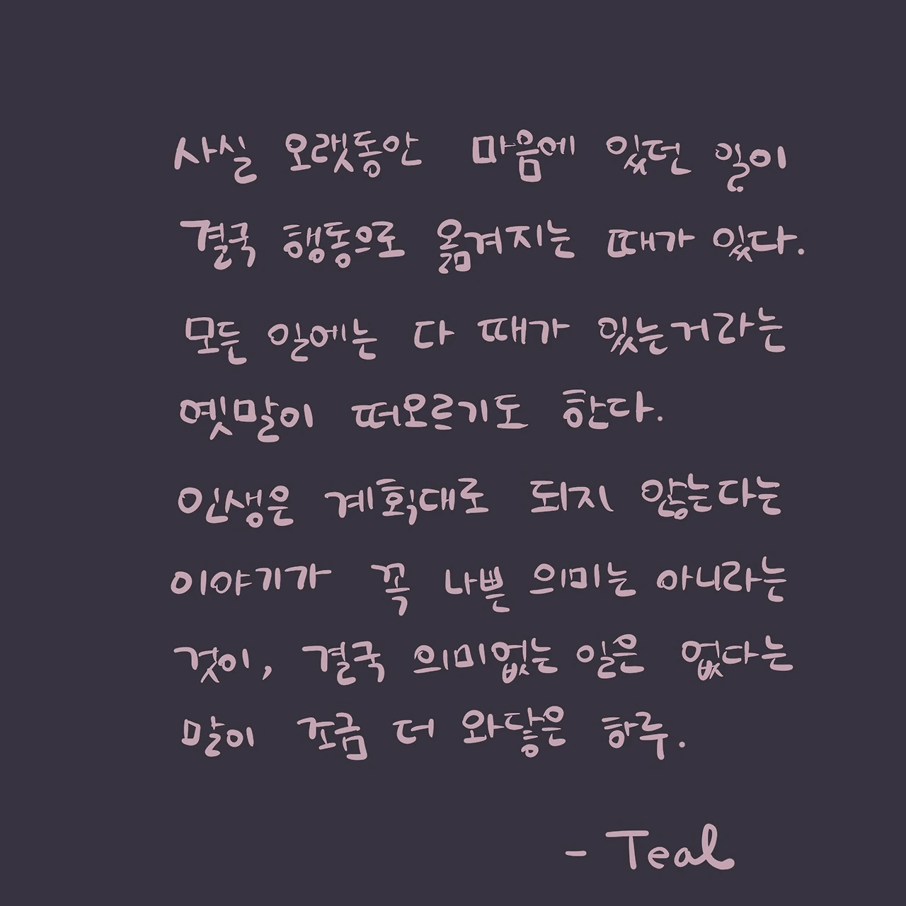그냥 우연히 툭 떠오른 생각이 하루의 기분을, 다음의 날들을 크게 변화시킬 수 있다. 물론 그 생각은 언제부터인가 마음 어딘가 잔잔히 채우고 있던 그런 것일지도 모른다. 그러다 마음이 요동치던 어느 날, 바깥 세상으로 그냥 한번 툭 나오는 그런 순간들이 있을지도 모른다. 그런 마음과 순간들을 알아보고 그냥 흘려보내지 않을 때, 어떤 변화가 일어나는것 같다. 그저 살아가는대로 살아가는게 아니라, 다르게 살아볼 수 있다는 것을 아는 것. 그렇게 어려워 보이지 않을지 몰라도, 생각보다 절대로 쉽지 않은 것.