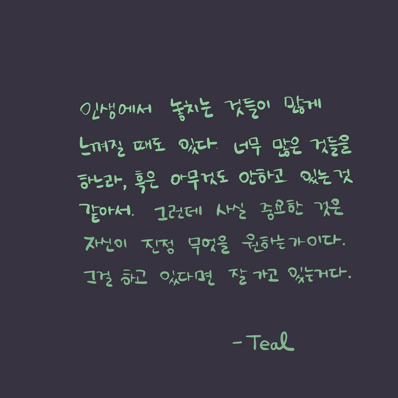 너무 바쁘게 지내고 있어서 혹은 너무 아무것도 안하고 있는 것 같아서 많은 것들을 놓치고 있다고 느껴질 때가 있다. 그럴 때는 자신이 진정 원하는 것이 무엇일까, 진짜 필요로 하는 것이 무엇일까 잘 생각해 볼 필요가 있다. 그리고 만약에 어떤 방식으로든 그것을 향해 가고 있다면 잘 가고 있는 것이다. 다만 그게 진짜 원하고 중요한 것인지를 잘 분별하는 것, 그렇기에 실제로 그 일을 해나가고 지속하는 것은 생각보다 쉽지 않다.