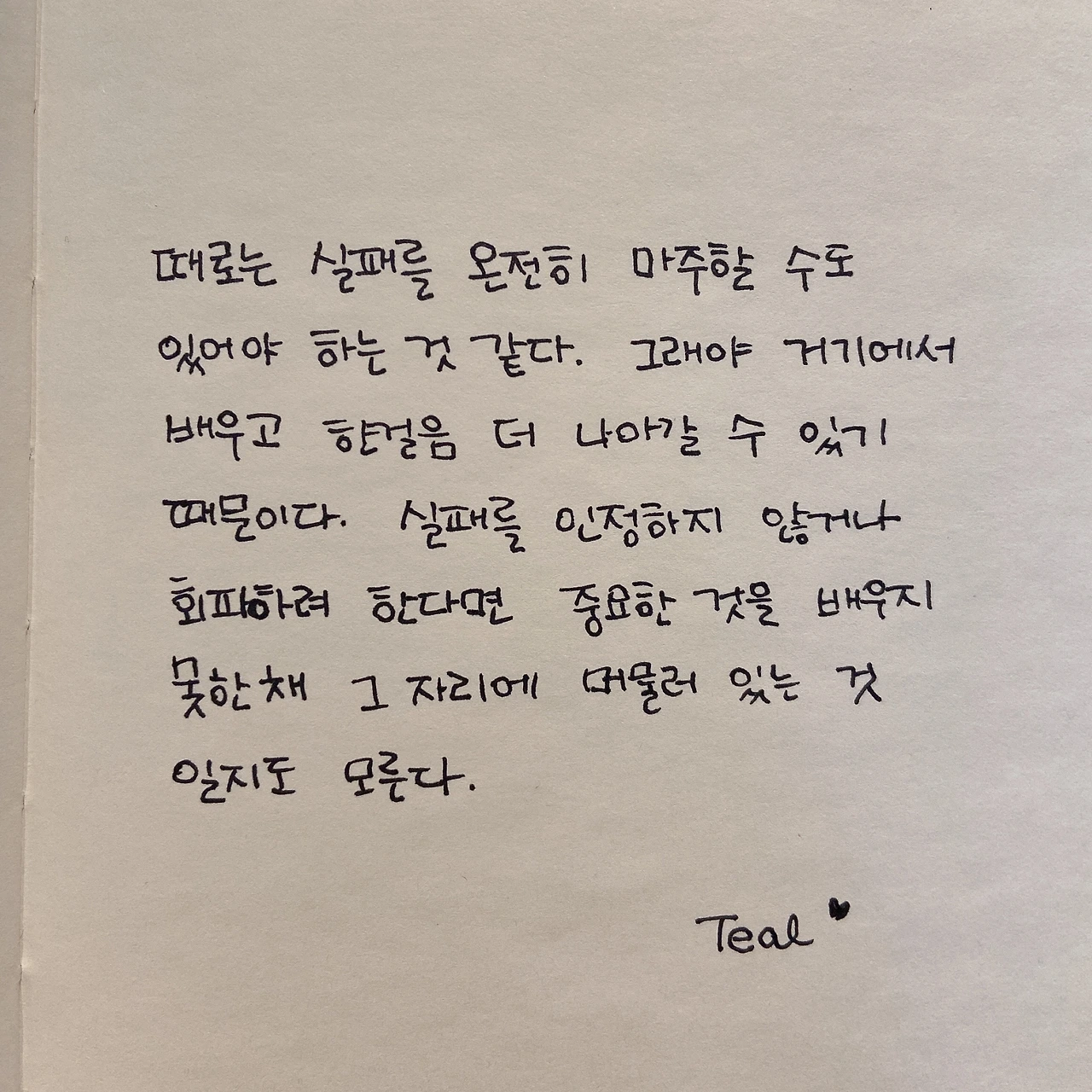 실패를 두려워하지 말고 거기서 배울 수 있는 것들을 놓치지 말자. 중요한 기회를 놓치고 있는 것일 수 있으니까.