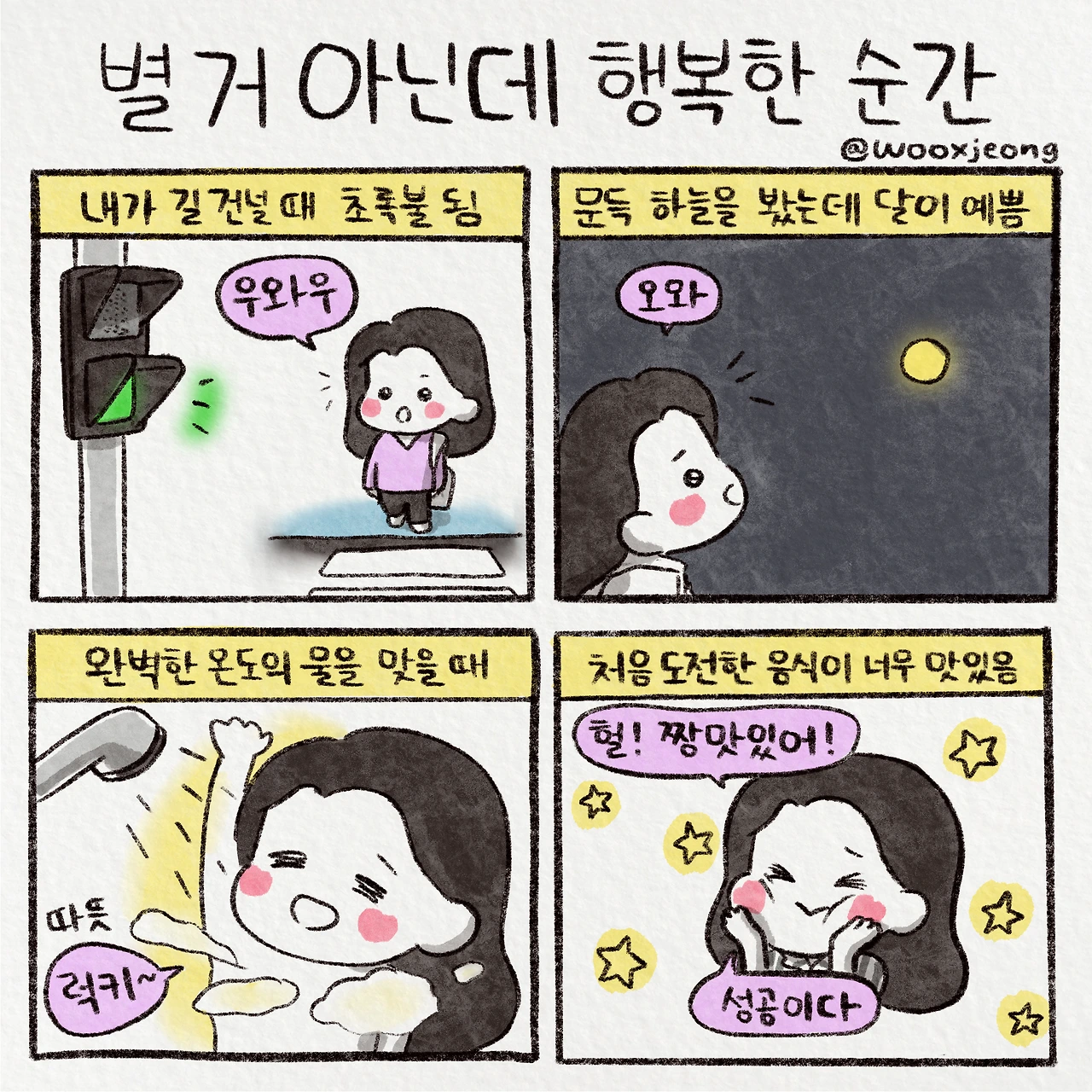 별 거 아닌데 행복한 순간들이 있어서 일상이 빛난다. 길을 건너려고 횡단보도 앞에서 걸음을 멈추려는 순간! 빨간불은 초록색으로 반짝인다든지, 밤늦도록 도서관에서 공부를 하고 나서는 길에 올려다본 하늘에서 커다란 달이 은은하게 반짝인다든지 하는 순간들 말이다. 이런 순간들이 우리들을 행복하다, 고 느끼게 만들어주는 게 아닐까. 사소하고 작은 반짝임들.