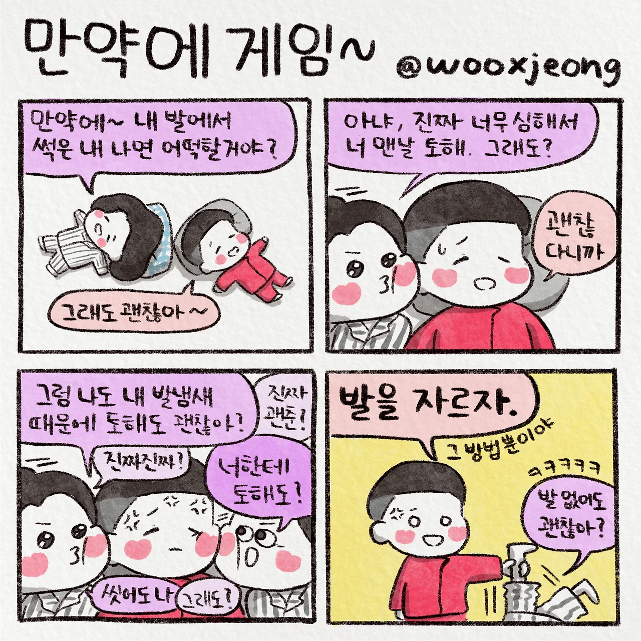 발을 자르면 괜찮아? 끝날 때까지 끝나지 않는 만약에 게임. 평소에는 얌전하다가도 만약에 게임을 시작하면 어딘가에 숨어있던 나의 짱구력이 스멀스멀 살아나 나를 지배한다. 남자친구가 극단적인 반응을 할 때까지 끈질기게 물고 늘어지다 마침내 해냈을 때의 쾌감이란… 이 맛에 사람을 놀리나보다.