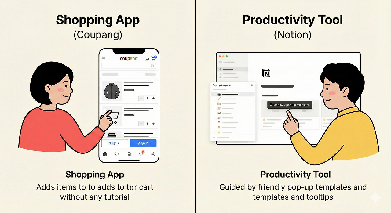 이미 잘 아는 고객 (쿠팡): 한국인에게 온라인 쇼핑은 익숙합니다. 쿠팡이 "장바구니는 여기 있어요"라고 튜토리얼을 띄우면 오히려 구매 흐름만 방해합니다. 이들에겐 '길을 터주는 것'이 최선입니다.