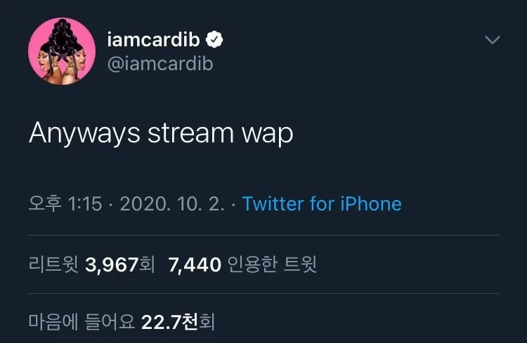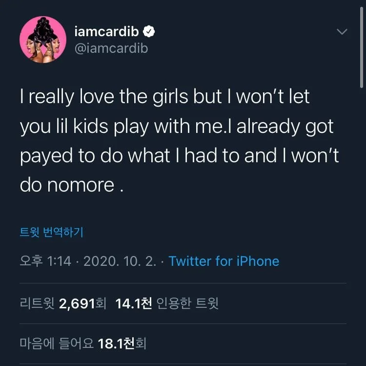 카디비는 트위터에서 "본인은 이미 돈을 지불받은 만큼 일을 했다. 그 이상의 일은 하지 않겠다. 본인의 곡인 WAP이나 들어라"라고 밝혔다.