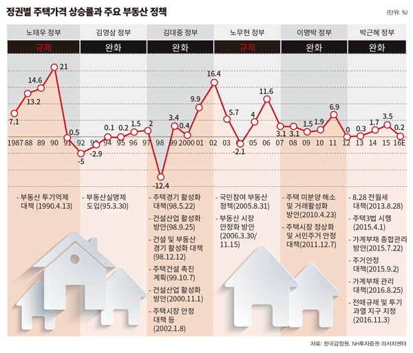 IMF 구제금융 이후 부동산 경기가 악화되자 정부는 부동산 경기 활성화 대책(규제 완화)을 내놓게 된다. 이후 시간이 지나면서 매수세가 회복되었다. (수요증가) 이에 부동산 가격은 점차 오르기 시작했다. 물론 몇 년 그렇게 부동산 가격이 가파르게 오르자 이를 잡기 위해 정부는 다시 부동산 시장 안정화 방안(규제 강화)을 시행하였고 이에 매수세는 약화되고 (수요감소) 부동산 가격은 다시 하락하기 시작하였다.