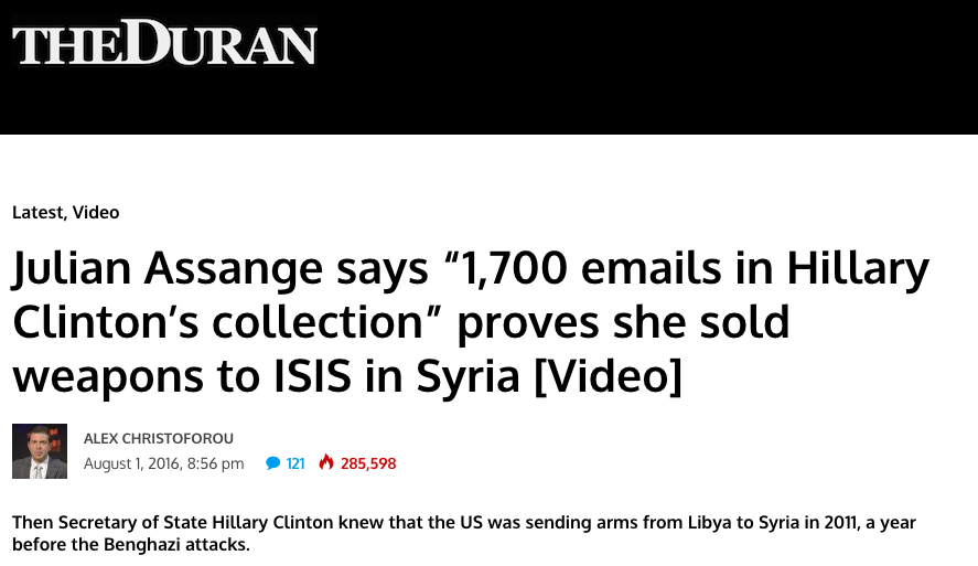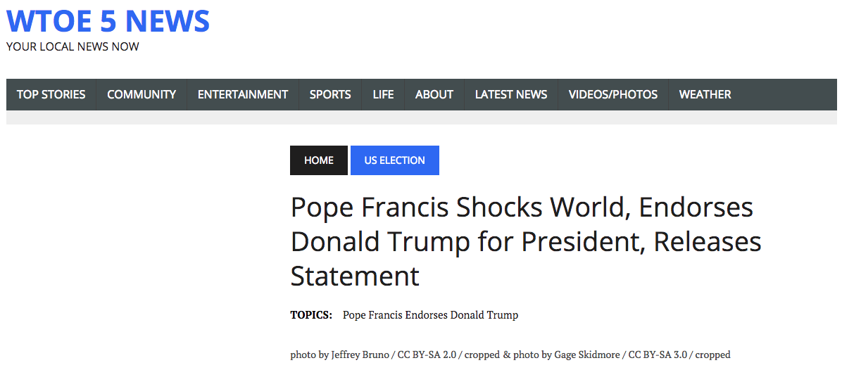 미국에서 가짜뉴스의 대표적 사례로 제시되는 것이, "교황이 트럼프를 지지한다"는 뉴스기사 article와 힐러리 클린턴이 테러단체 이슬람국가(IS)에 무기를 팔았다는 뉴스기사 article인데, 온라인 언론사에서 생산한 뉴스 형태를 띤 허위사실인 전형적인 가짜뉴스이다.