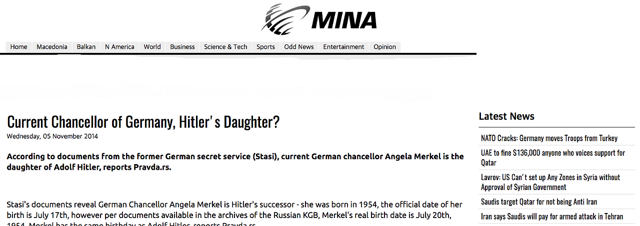 독일의 경우, 메르켈 총리가 히틀러의 딸이라는 뉴스기사 article도 있었다. 역시 전형적인 가짜뉴스 사례다.
