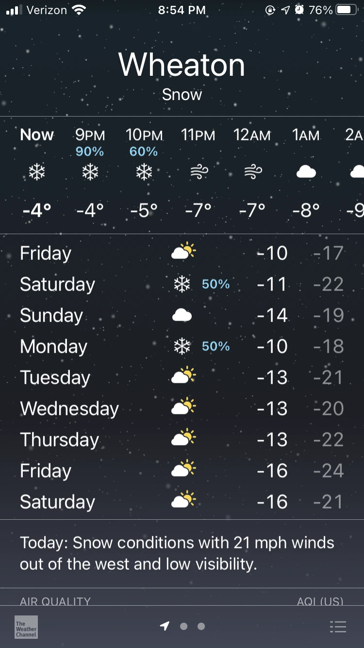 시카고에도 한파가 찾아왔다. 오는 일주일이 올해 제일 추운 7일이 될 듯하다. 예보상 주간 최고기온은 영하 10도, 최저기온은 영하 24도다. 미시간 호수 찬바람까지 더해져서 체감은 북극 느낌이 물씬 날 듯하다. 아니다, 이 정도면 반대로 북극이 시카고 느낌 난다고 할 수도 있겠다.