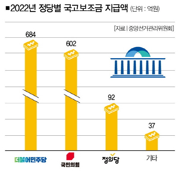 2024년 22대 국회의원선거 정당 선거보조금은 전체 규모가 약 500억 정도이다. 이에 따라 국회교섭단체를 구성한 정당인 국민의힘과 더불어민주당은 그중 절반인 약 250억을 각각 125억여 원씩 나눠갖는다. 그리고 5석 이상을 가지고 있는 정의당(6석)이 5%인 약 25억을 지급받는다. 5석 미만의 소수 정당 역시 기준에 맞게 약간의 선거보조금을 지급받는다.