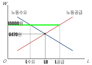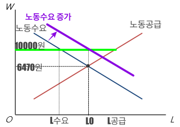 고용주(사업주)의 노동에 대한 수요는 'L수요'로 축소되는 반면, 노동에 대한 공급은 'L공급'으로 증가하게 된다. 그 결과 원래 일하고 있던 L0 중 'L0-L수요' 만큼 실업이 발생하게 된다. (2의 경우)