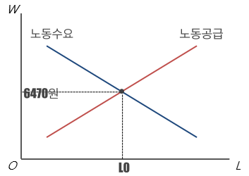 현재 최저임금 상태에서 노동시장의 공급과 수요가 균형을 이루고 있다고 생각해보자. 현재 전체 노동자 수는 L0이다.