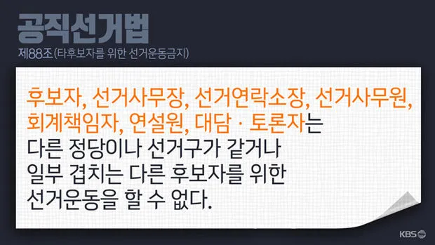 공직선거법은 타후보자를 위한 선거운동금지 규정을 두고 있다. 후보자, 선거사무장, 선거연락소장, 선거사무원, 회계책임자, 연설원, 대담토론자(이하 “후보자 등”)는 다른 정당이나 선거구가 같거나 일부 겹치는 다른 후보자를 위한 선거운동을 할 수 없다는 내용이다.