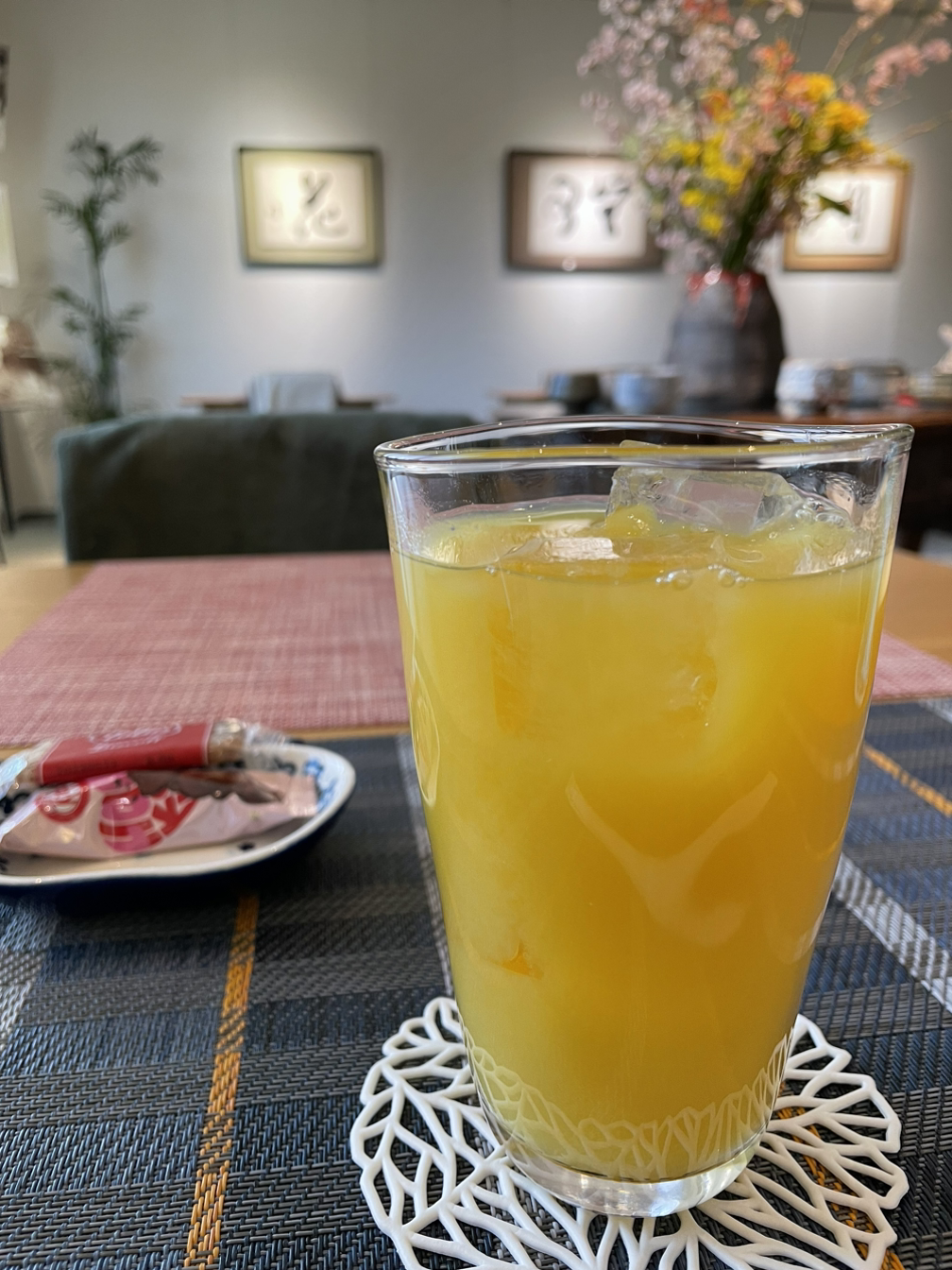 직원이 와서 물컵을 내려놓으며 폭포수처럼 쏟아지는 일본말을 흩뿌리는데 하나도 모르겠다. 얼른 파파고를 꺼내 들이민다. 순조롭게 진행이 안된다. 그렇게 해서는 안 되겠다. 바쁜 사람들인데 메뉴는 최대한 빨리 정해주는 게 좋겠지. 그냥 젤 위에 있는 오늘의 요리 주세요 했다. 그리고는 디저트로 코히랑 티랑 주스를 말하길래 당연히 여긴 귤의 고장인데 오렌지 주스 달라고 했다.