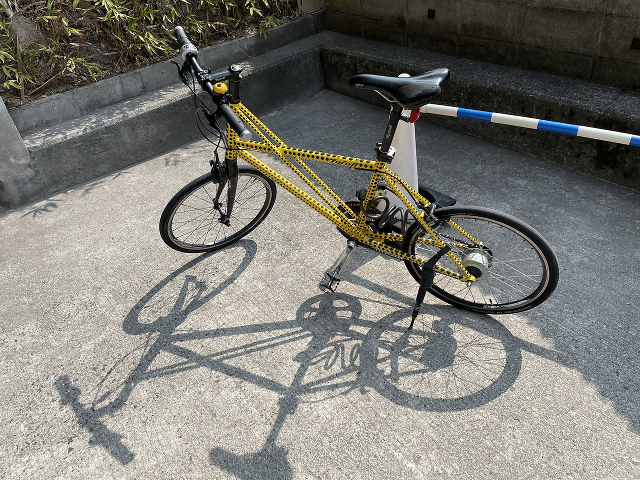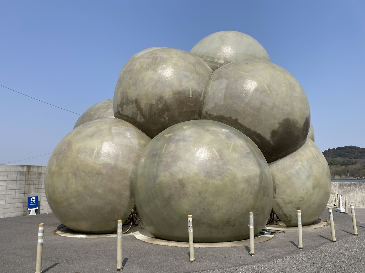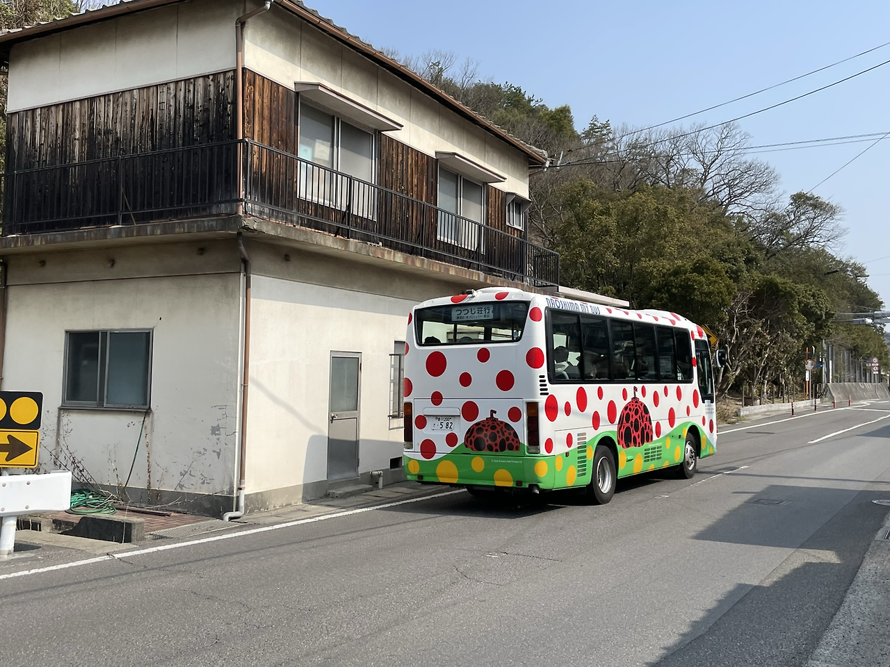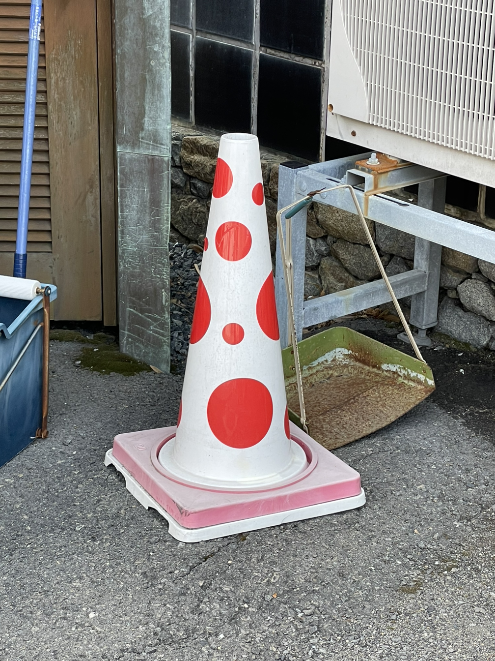 편의점 도시락을 하나 샀다. 내가 좋아하는 계란 말이와 다양한 나물 반찬들이 들어 있는 일본 도시락. 태생적으로 겸손한 입맛으로 무엇이든 맛있게 감사히 잘 먹는 나에게 흠잡을 거 없는 도시락이다. 벤치에 앉아서 맛있게 먹는데, 오오! 세상에나, 너무나 예쁜, 빨간 땡땡이와 야요이의 호박이 그려진 버스가 내앞으로 지나간다. 그 이후에도 볓 번 만나게 되는 나오시마 섬의 버스들이 모두 땡땡이 버스였다. 참으로 신박하다. 이 땡땡이 시리즈는 버스 뿐 아니라 섬을 돌며 땡땡이 자전거도 만났고 땡땡이 주차금지대도 만나며 나를 즐겁게 만들어 줬다. 땡땡이가 이 섬에 얼마나 큰 활기를 불어 넣는지 그 땡땡이들은 알고 있으려나?