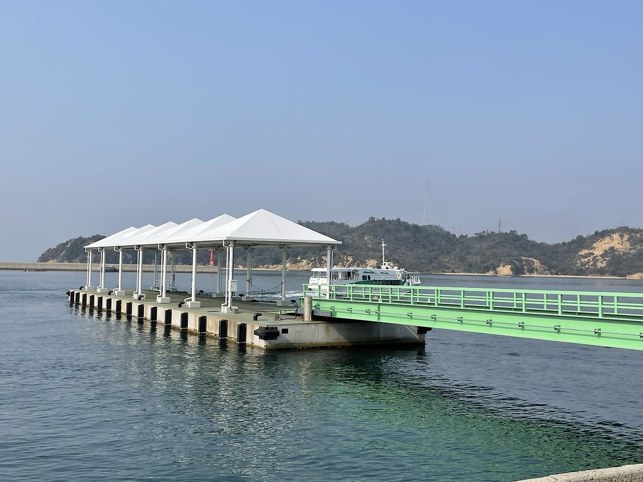 악기없이 떠나기로 결정하고 가벼운 에코백 하나 메고 나오니 홀가분하다. 그렇게 행복한 존재임에도 불구하고 무거운 건 무거운 거다. 이러니 오랫동안 연주하고 노래하려면 정말 건강해야한다 다시 느낀다. 나오시마도 역시나 배를 타고 가야하니 다카마쓰 항으로 향한다. 쇼도시마와는 달리 나오시마는 쾌속선을 타고 가기로 했다. 아마도 배타고 가는 시간이 많이 단축될 것이다. 그러나 티켓 금액은 1220엔, 쇼도시마의 두배도 넘는 금액이다. 쾌속선이라 그런지 커다란 페리에 비해 아주 작아보였다. 2023년 3월 8일 수요일, 평일인데도 불구하고 사람들이 쾌속선안을 가득 채웠다. 역시나 인기 많은 섬, 나오시마! 속도가 빠른 만큼 쾌속선이 가르는 바다의 물살또한 아주 경쾌했다. 속이 뻥 뚫리는 시원함을 한 시간 가량 즐기며 달리다 보니 초록의 다리가 인상적인 나오시마의 항구가 드디어 보였다.